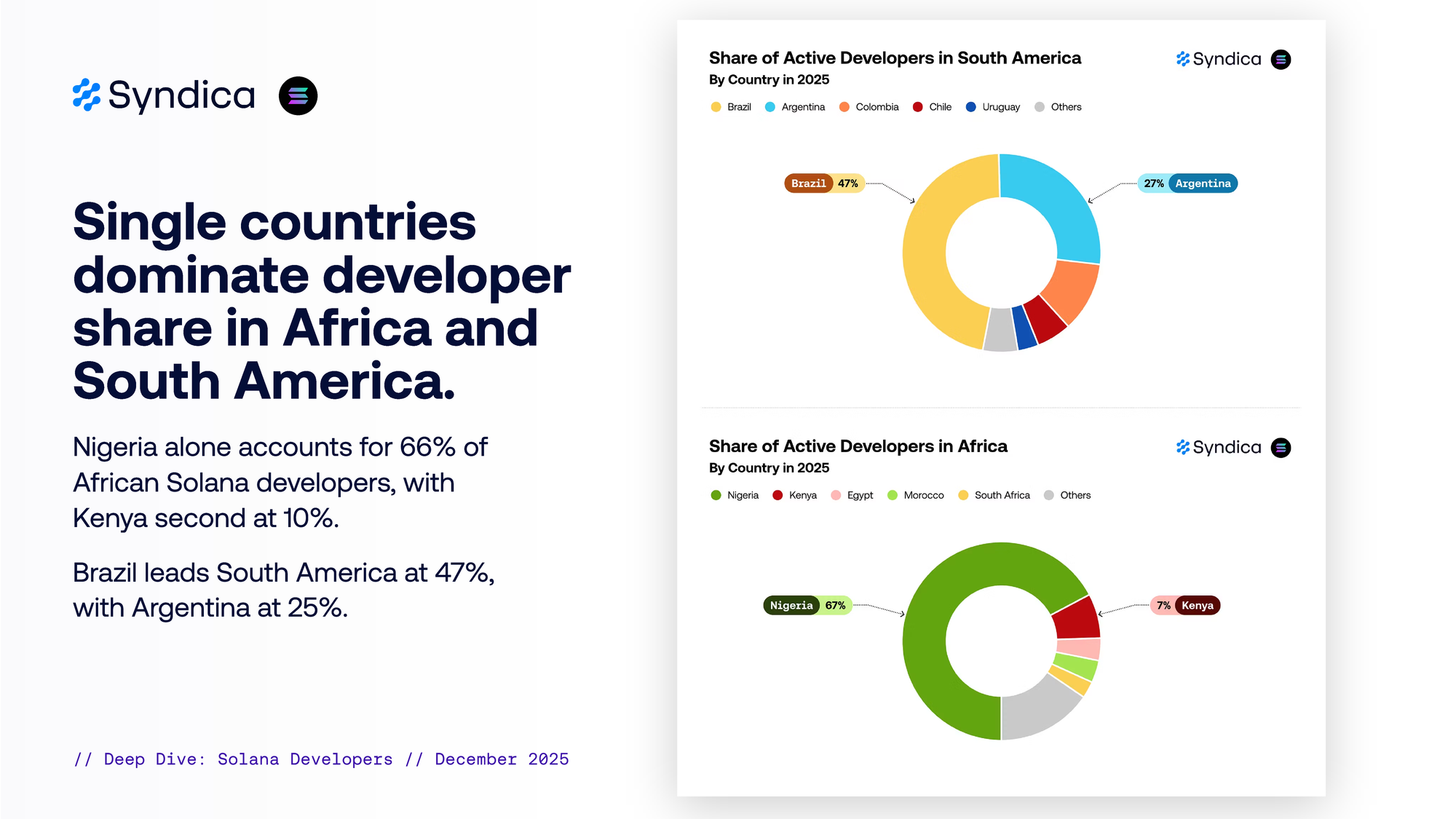 在非洲和南美洲,单一国家主导着开发者的份额。