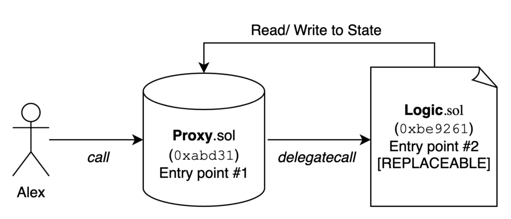 大多数代理合约都使用 delegatecall 来调用逻辑合约;对代理的传入调用会通过 delegatecall 转发到实现合约,实现合约可以被新的/修改过的合约替换。代理仍然是存储和面向用户的合约。