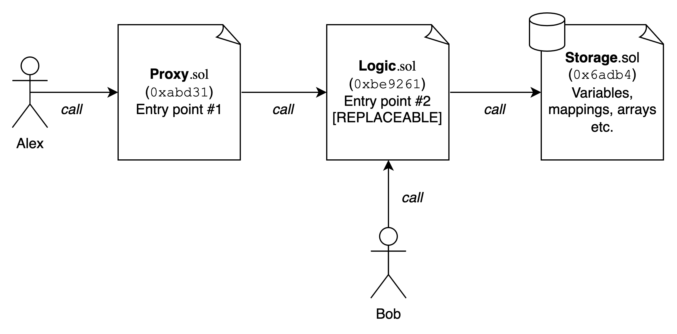 通常,代理合约本身持有状态,并使用实现合约作为逻辑层。然而,正如上面通过基于 call 的代理所解释的,情况并非总是如此。对于某些合约,代理充当“中继”合约,实现合约充当逻辑层,而第三个状态合约充当存储层。