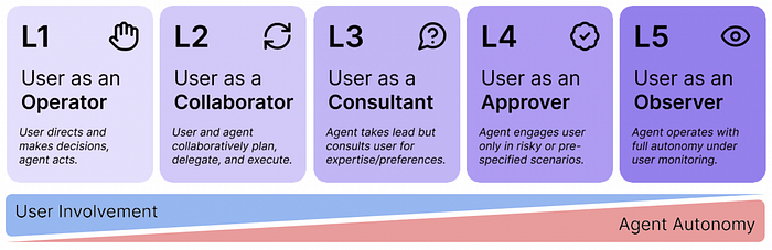 为了构建 Agentic AI 系统,我们需要了解智能 Agent 拥有的自主程度,这可以从用户作为真正的操作者 (L1) 到人类纯粹作为 Agent 的观察者 (L2) 不等。如图 1 [1] 所示。随着我们从 L1 转向 L5,将行为归因于人类变得越来越困难,因为 Agent 在其方法上变得更加独立。
