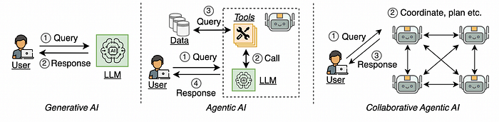 图 2:生成式 AI、Agentic AI 和协作式 Agentic AI [2]