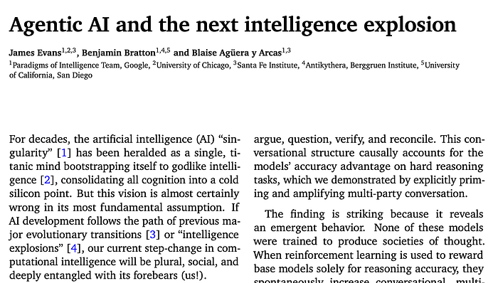 但是,如果我们相信科幻小说中对 AI 奇点的描述,我们通常会将其视为一个单一的、全能的、能够像人脑一样推理的机器。作为人类,我们经常对一个复杂的问题思考很久,却得不出答案。为了解决我们的问题,我们经常形成“思想社会”,在那里我们辩论、分歧、验证,然后达成一致。在这篇论文中,作者提出 AI 奇点的模型是一个涉及这些互动的模型 [ 这里]: