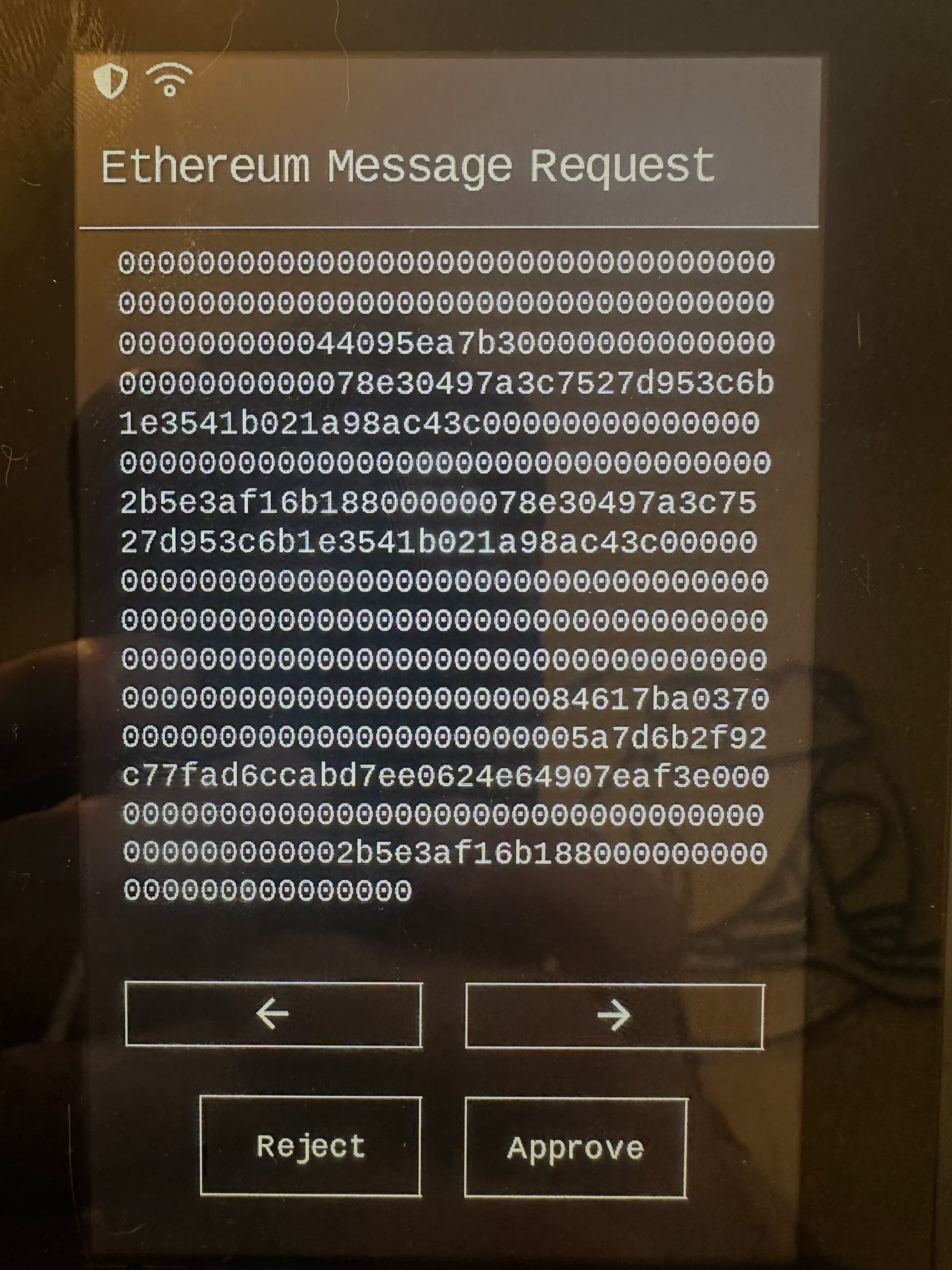 domainSeparator = hashStruct(eip712Domain)hashStruct(message)encode(domainSeparator : 𝔹²⁵⁶, message : 𝕊) = "\x19\x01" ‖ domainSeparator ‖ hashStruct(message)在硬件设备上验证数据极具挑战性。近期发生的 Bybit(14 亿美元)、WazirX(2 亿美元)和 Radiant Capital(5000 万美元)黑客攻击事件表明,在设备上验证签名内容至关重要。由于网站可能被黑客攻击,我们不能信任网站发送给钱包的数据,必须完全依赖钱包来显示正确的信息。