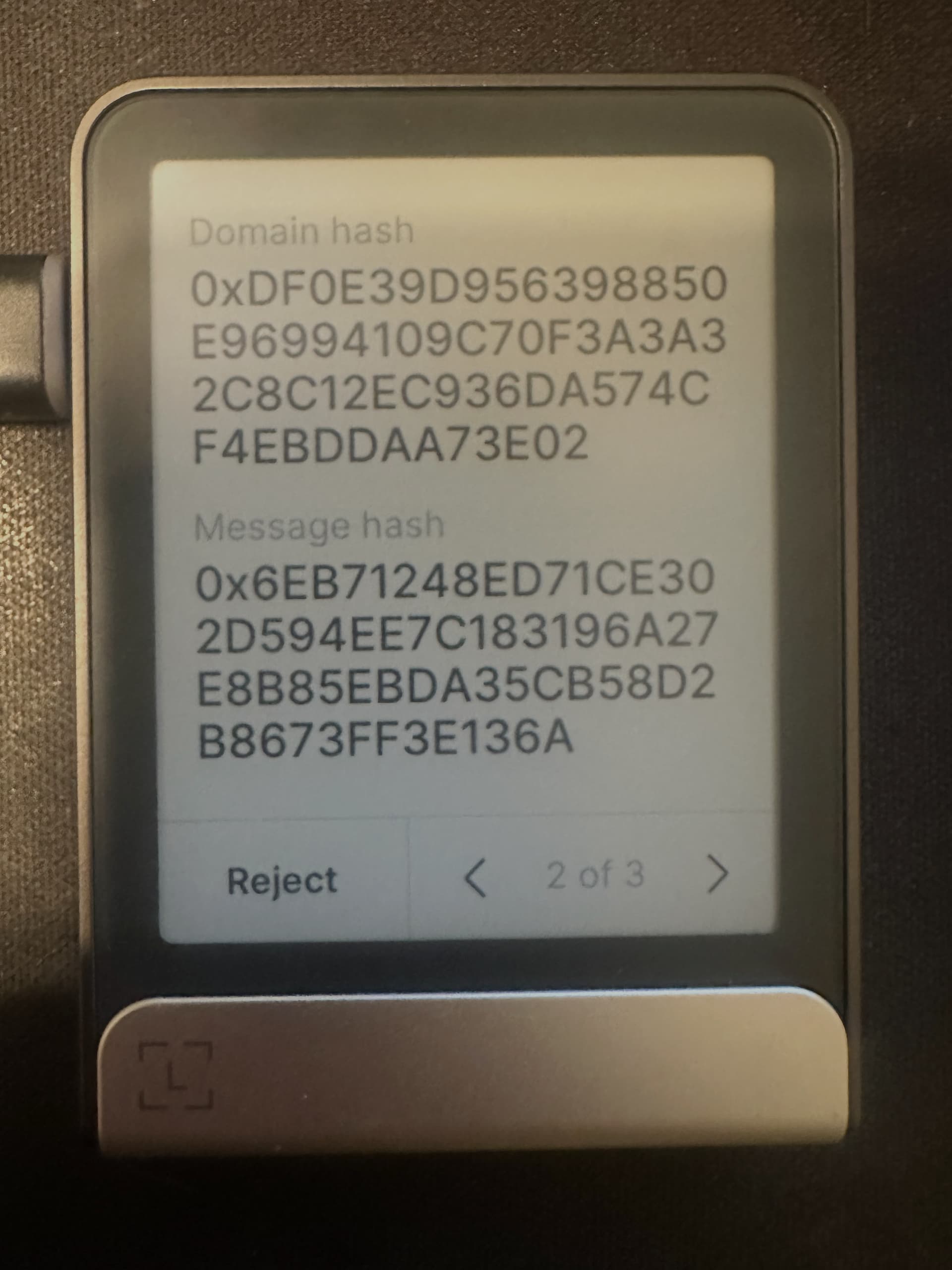 对于 EIP-712 数据,如果设备显示整个结构体,用户要么依赖一台设备提取结构体并在另一台设备上验证,要么必须逐个字符肉眼比对。对于小型结构体这还可以接受,但对于大数据量,这项任务极其困难。