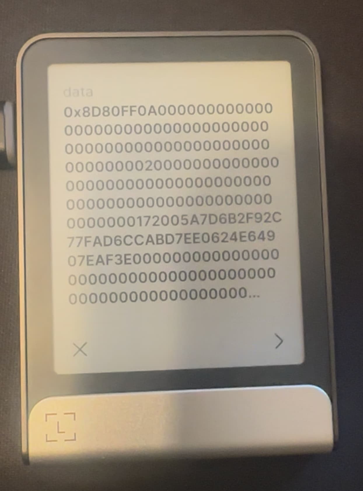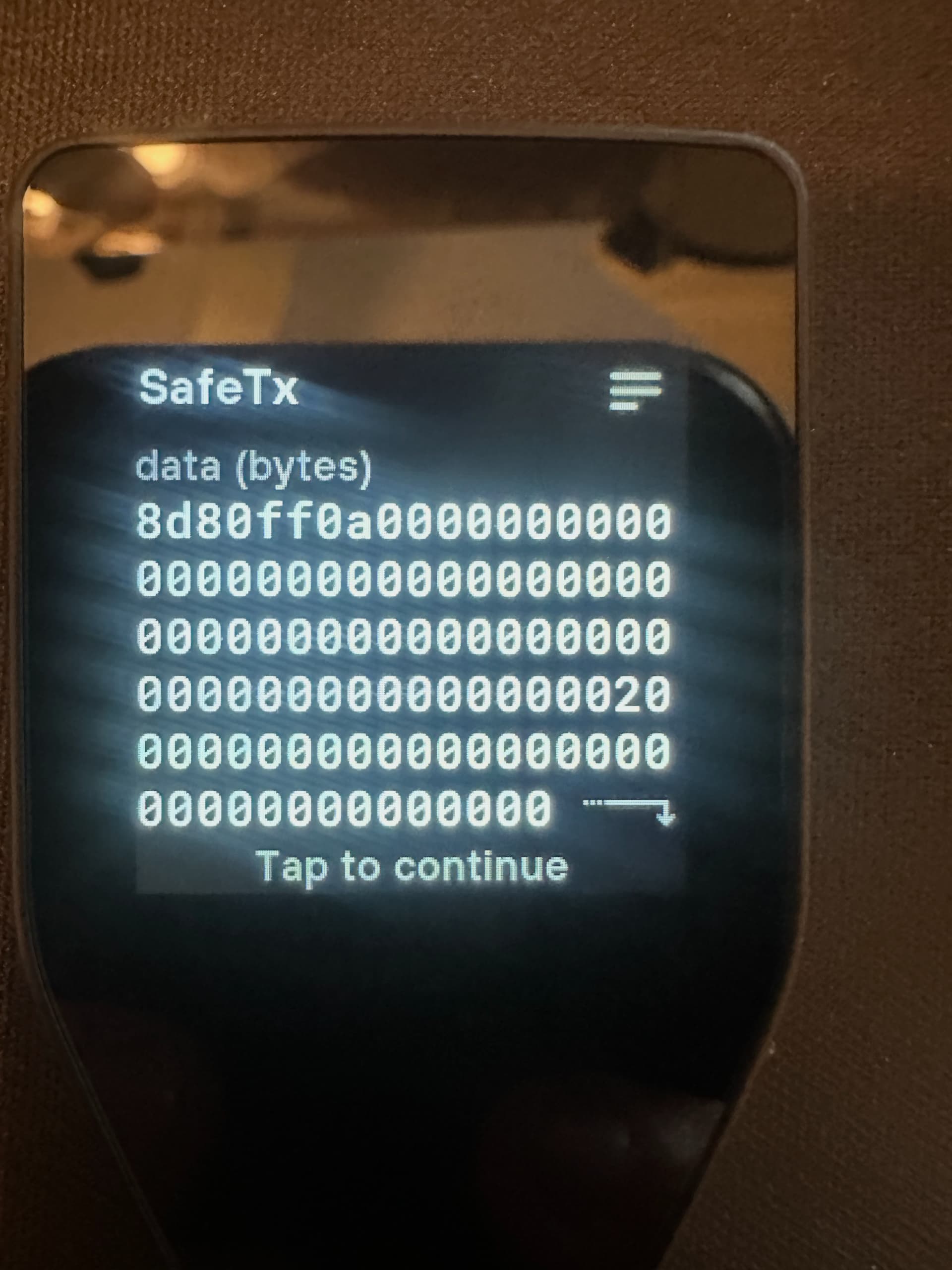 data 部分填充了与批量交易相关的 calldata。在电脑上,复制并验证这些数据并不难。但让我们看看不同硬件钱包上的显示情况: