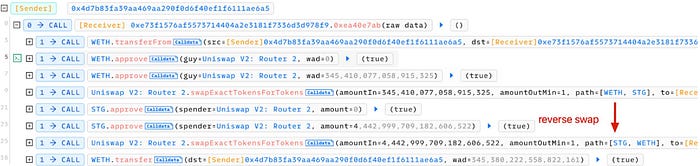问题是,为什么受害者(MEV 机器人)愿意使用 2,454 WETH(价值约 500 万美元)在池中兑换 4.5 STG 代币(价值约 3 美元)?请注意,当受害者执行此 swap 时,池中的流动性非常低(0.005 WETH 和 4.5 STG)。