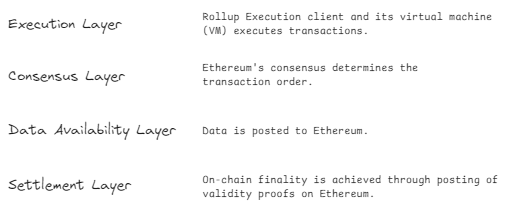 • 结算层: 由于有效性证明发布在以太坊 Layer 1 上,因此结算层也是以太坊。用户可以随时访问在以太坊上验证的 Layer 2 状态。