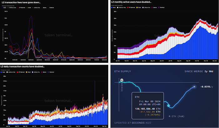 从左上顺时针移动:L2 交易费用,L2 上的月活跃用户,L2 上燃烧的费用,L2 交易数量 (来源: tokenterminal)
