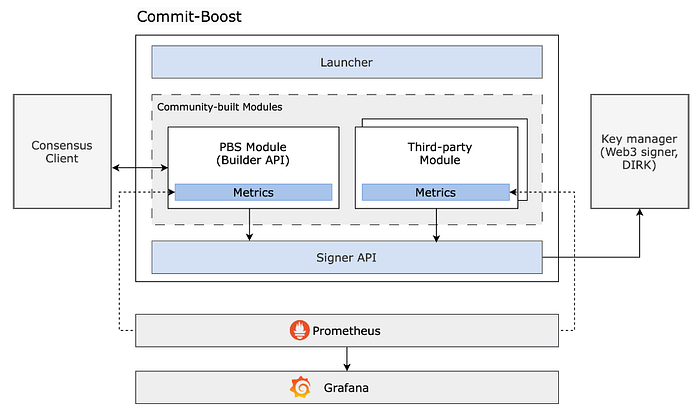6. 像 Prometheus 和 Grafana 这样的监控和可视化工具允许实时监控 Commit Boost 的状态。
