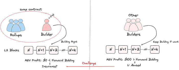 为了防止此类 builder 滥用,也可以允许未选择的 builder——那些未在 Swap 合约中选择的 builder——构建 L2 rollup 区块。这些未选择的 builder 将在其协议的链上/链下系统中持续发布其区块构建记录。然后,如果一个滥用的 builder 试图通过保险索取协议 token,则可以使用公开发布的 L2 区块构建记录来发起挑战。如果挑战成功,则对滥用的 builder 处以惩罚,并将一部分保险金奖励给挑战者,从而减轻滥用。