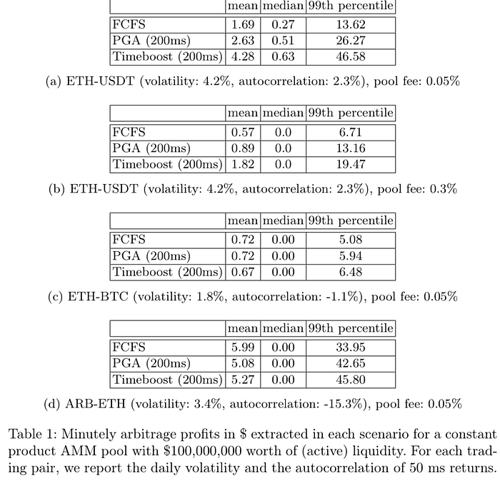 上图比较了套利者通过在三种机制(FCFS、PGA(优先级 Gas 拍卖)和 Timeboost)中选择最佳策略可以提取的 MEV 金额。它表明,根据套利者的信息优势,Timeboost 通常提取更多的 MEV。换句话说,即使在使用加密内存池时,在固定期限内授予特定套利者优先于他人包含交易的权利通常会导致更高的可提取 MEV,从 LVR(重新平衡损失) 的角度来看,这可能会导致 DEX 用户,尤其是流动性提供者 (LP) 的更大损失。