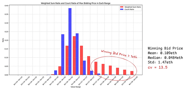 在上图中,x 轴(以对数尺度表示)代表每个区块中标价格所在的范围,y 轴显示每个范围内区块的绝对百分比。蓝色条表示每个范围内中标价格的比例,而红色条表示每个范围的归一化加权总和(中标价格乘以比率)。统计分析得出中标价格的以下结果: