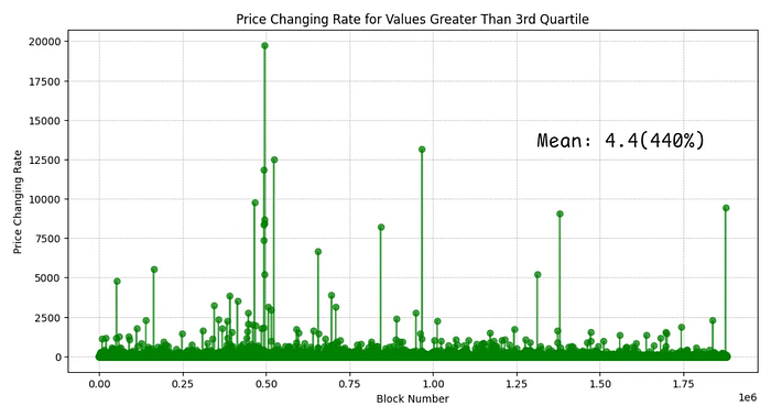 此图显示了中标价格高于第三四分位数(0.088 ETH)的区块,其中标价格与前一个区块相比的百分比变化。x 轴列出了每个中标价格高于第三四分位数的区块(以不连续的方式),y 轴显示了相对于前一个区块的变化率。即使不将分析仅限于异常值,高于第三四分位数的区块也显示出与前一个区块相比,平均竞标价格变化超过 400%。此外,如果我们将分析限制为中标价格为 1 ETH 或更高的区块,平均变化率达到 5953%,表明波动非常剧烈。考虑到在一次飙升之后,中标价格往往会在一段时间内保持相似,这些异常值事件可能会导致远超计算平均值的价格变动。