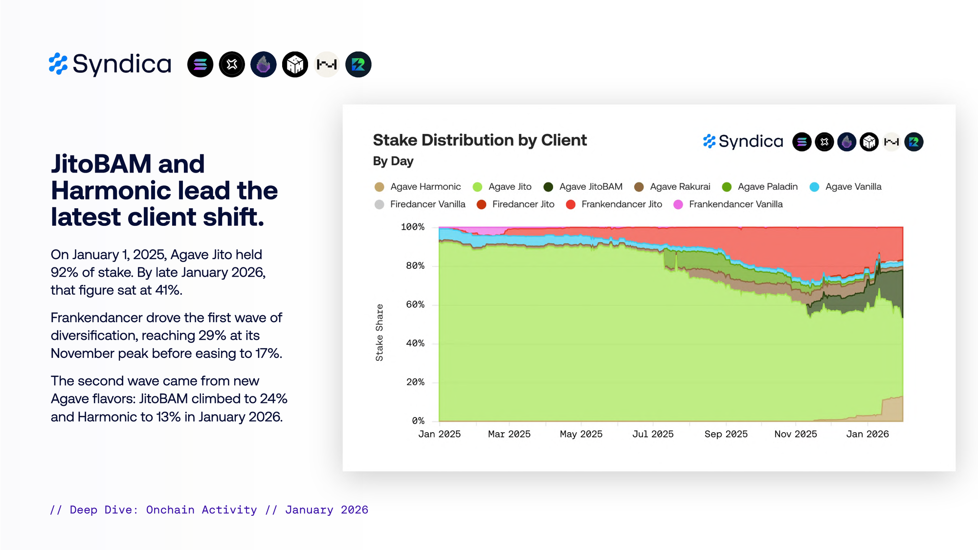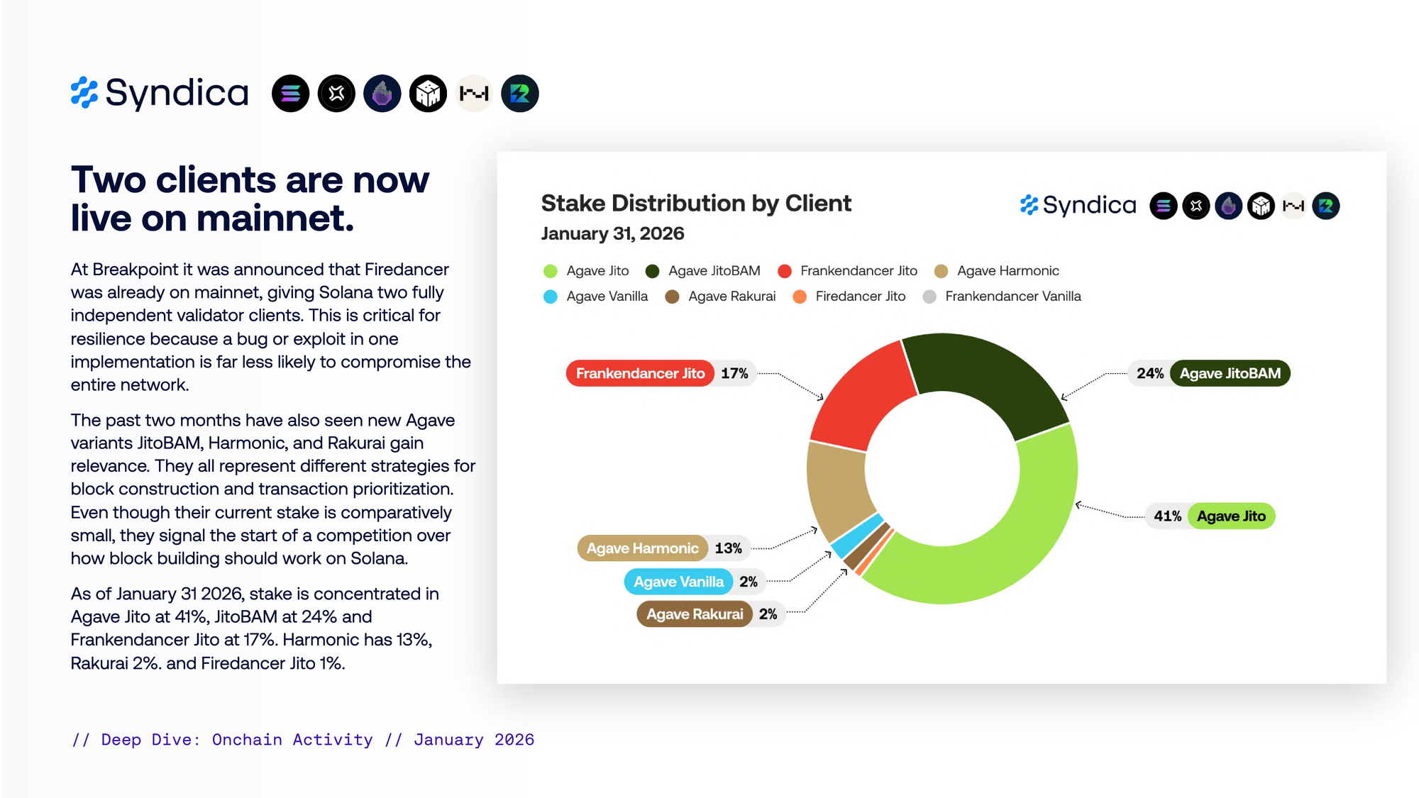 截至 2026 年 1 月 31 日,stake 集中在 Agave Jito(41%)、JitoBAM(24%)和 Frankendancer Jito(17%)。Harmonic 占 13%,Rakurai 占 2%,Firedancer Jito 占 1%。