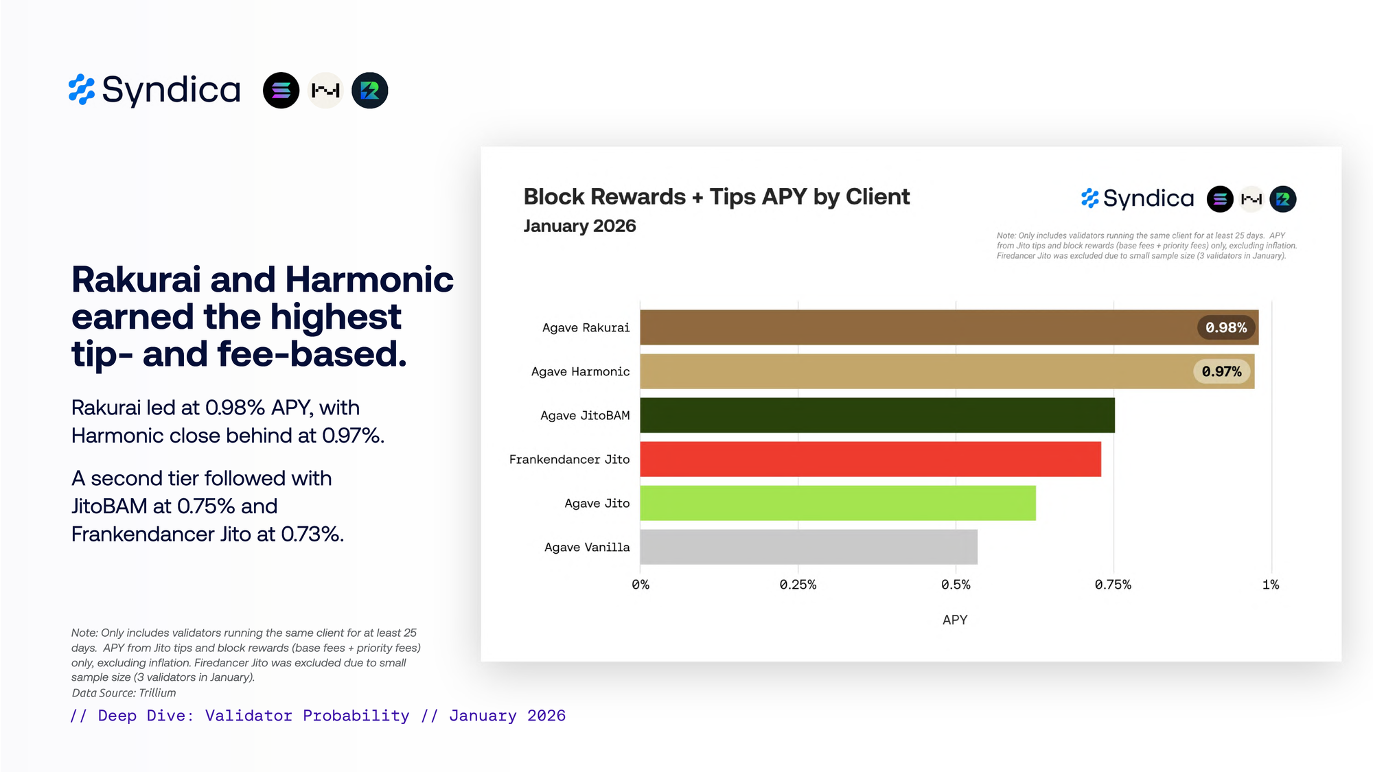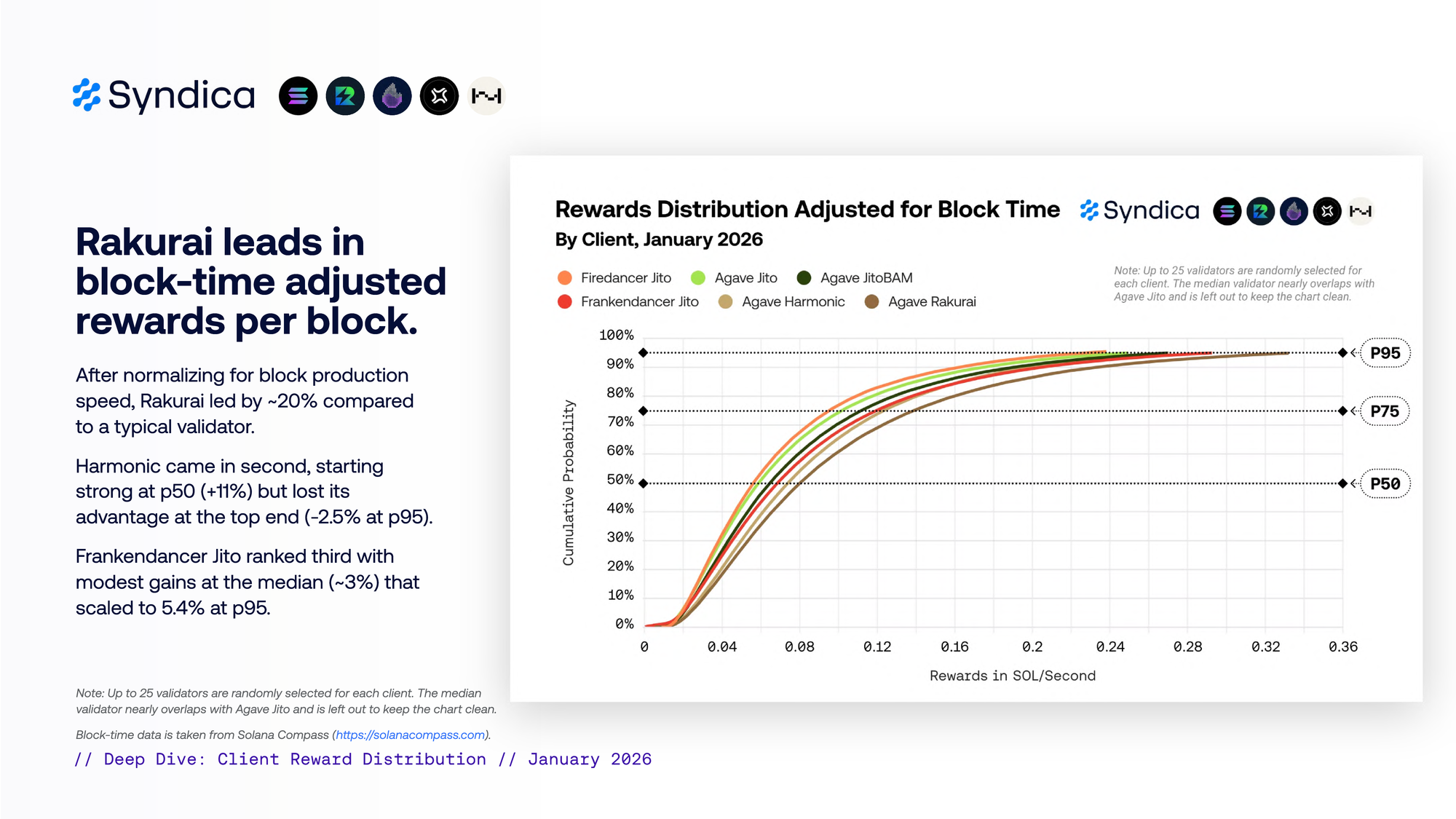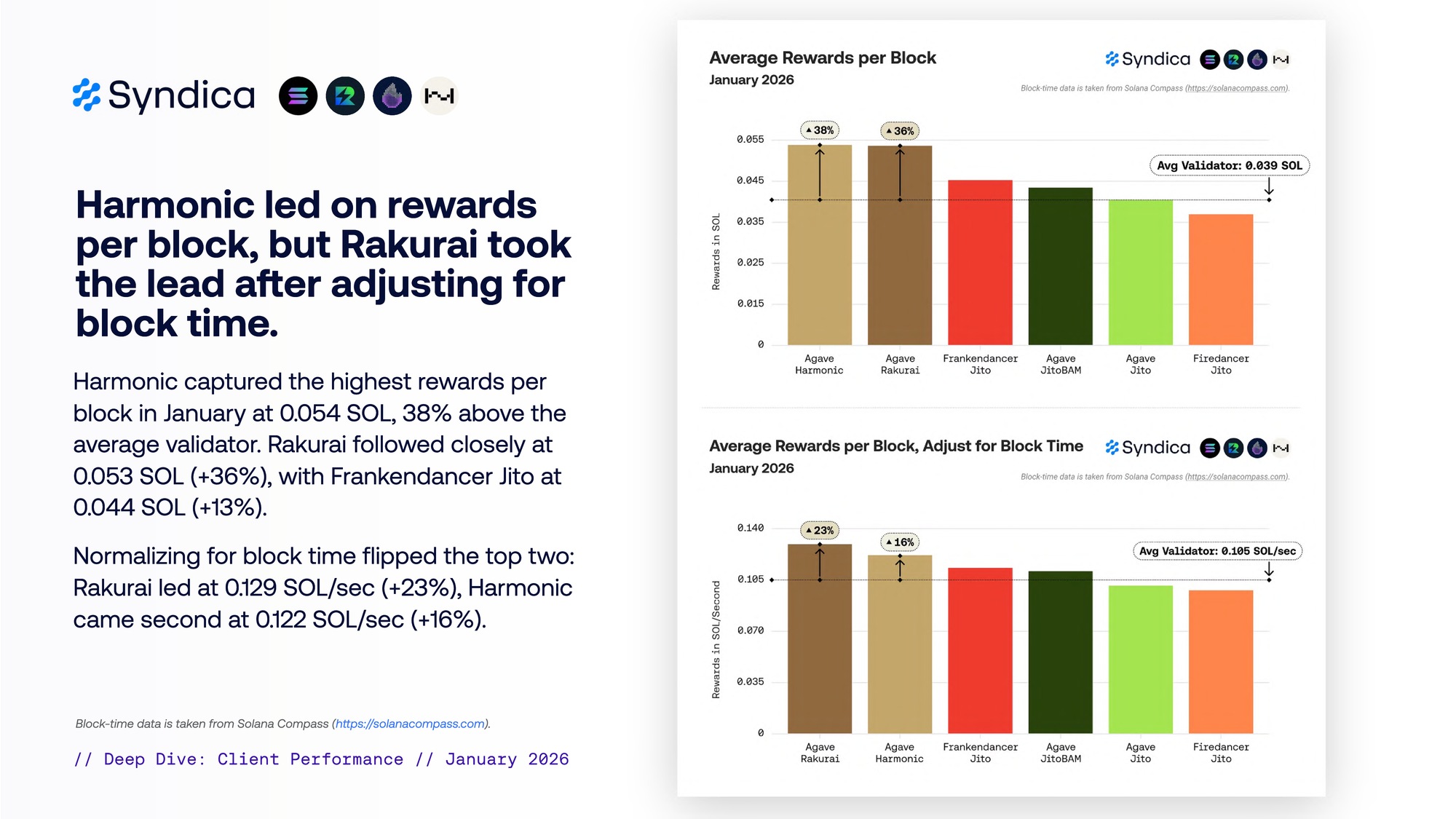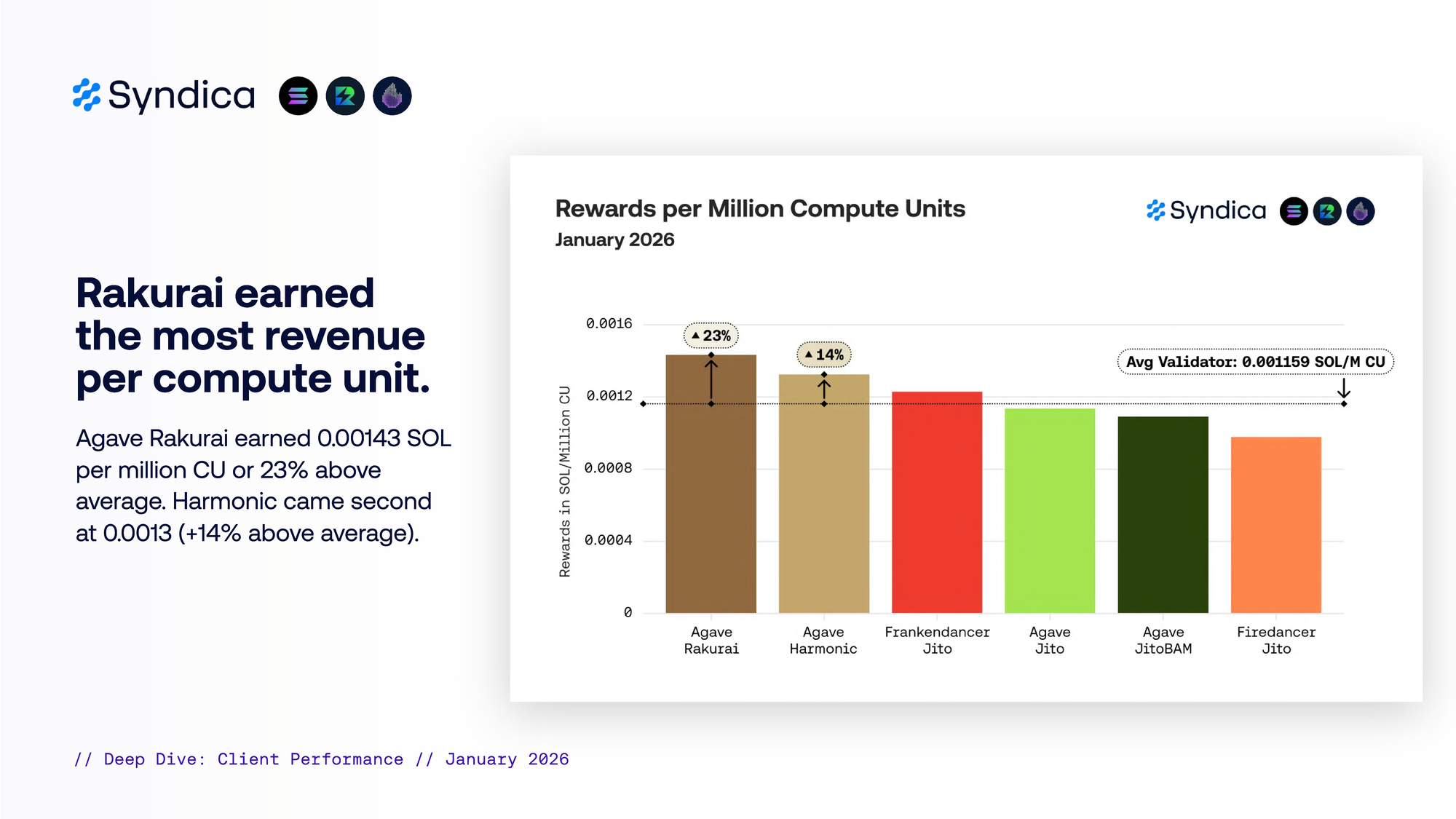 Agave Rakurai 每百万 CU 赚取 0.00143 SOL(高于平均水平 23%)。Harmonic 位居第二,为 0.0013 SOL(高于平均水平 14%)。