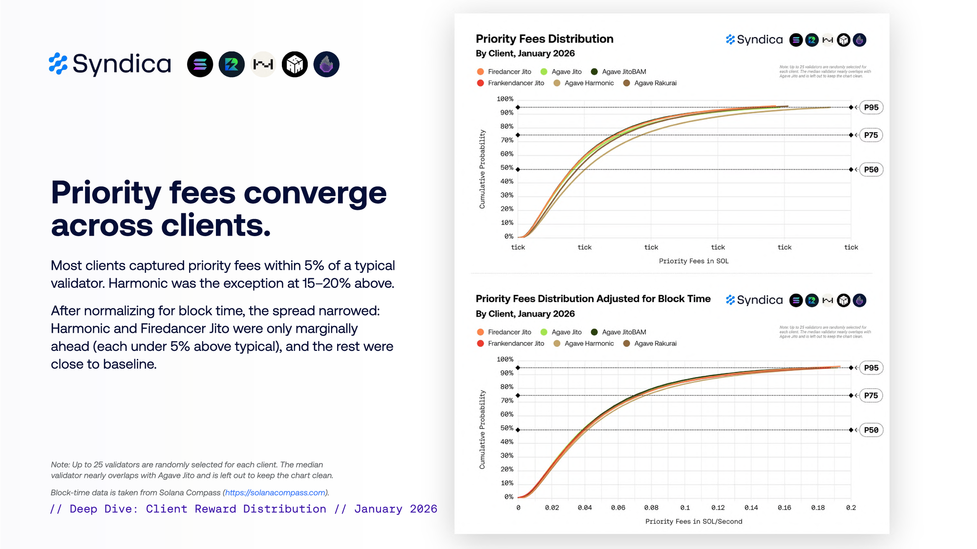 大多数客户端捕获的 priority fees 在典型 validator 的 5% 以内。Harmonic 是例外,高出 15–20%。