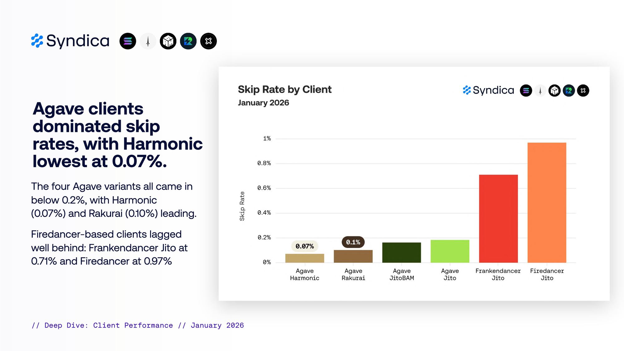 Agave 客户端在 skip rates 方面占据主导地位,Harmonic 最低,为 0.07%。
