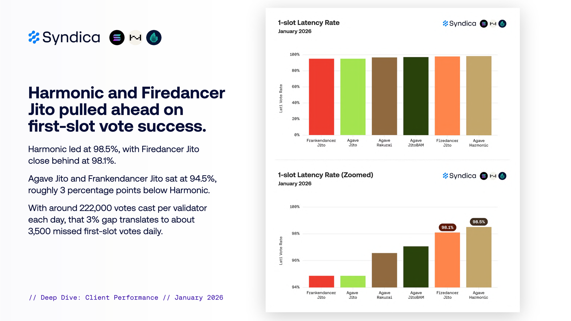 Harmonic 和 Firedancer Jito 在首次插槽投票成功率上领先。