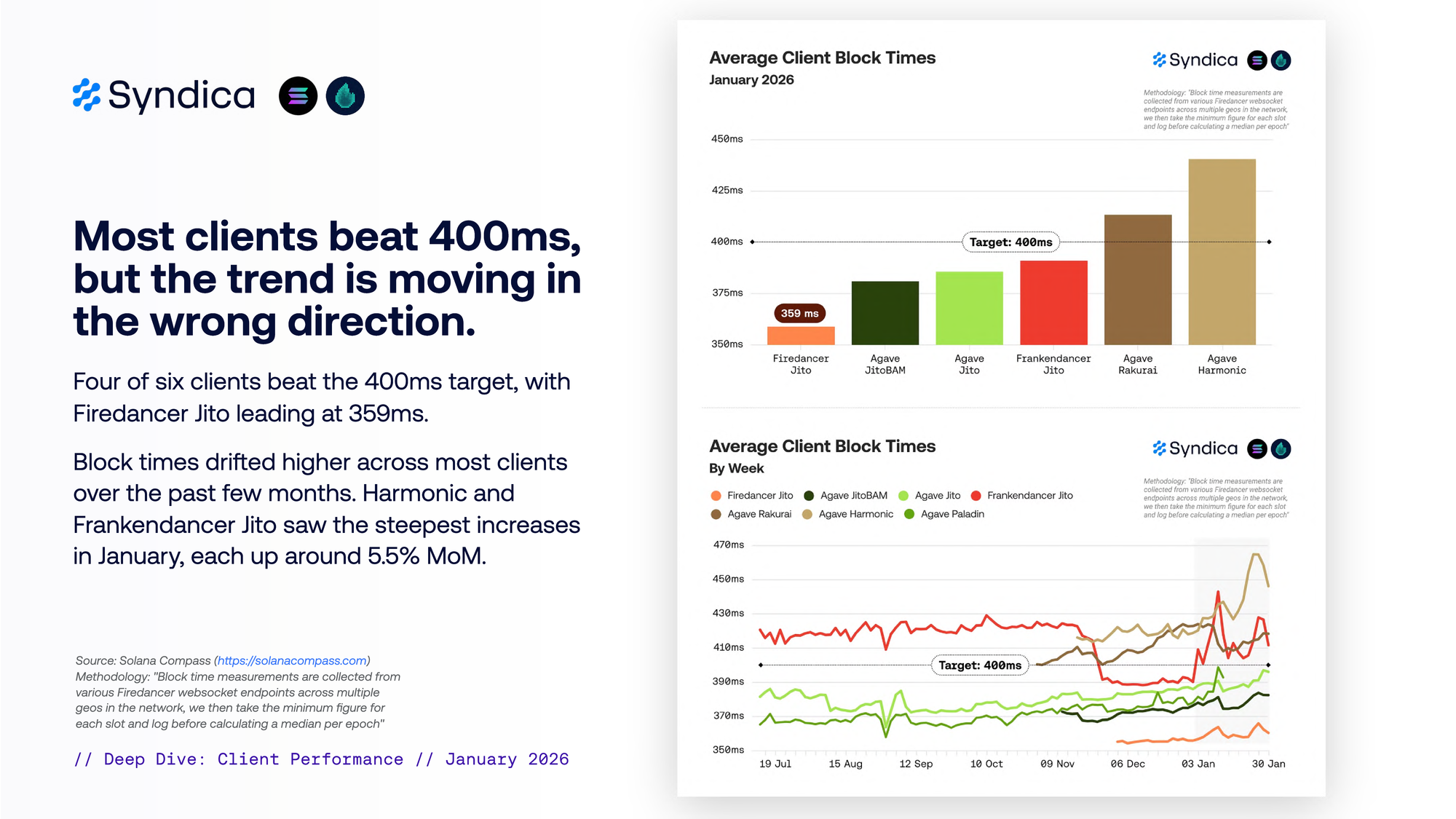 六个客户端中有四个达到了 400ms 的目标,其中 Firedancer Jito 以 359ms 领先。
