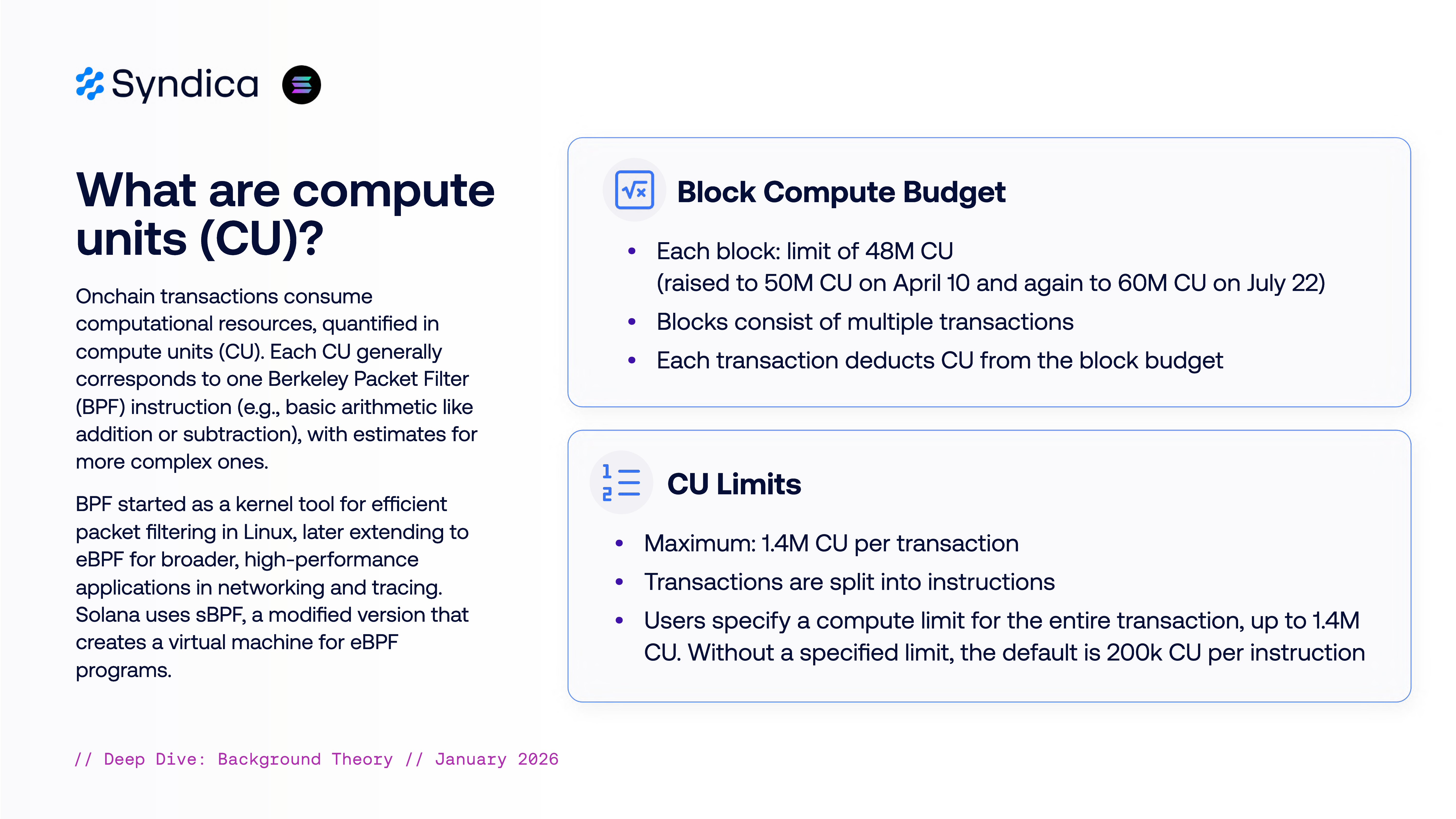 Compute Units 代表交易消耗的计算资源。每个 CU 大致对应一个 Berkeley Packet Filter (BPF) 指令。