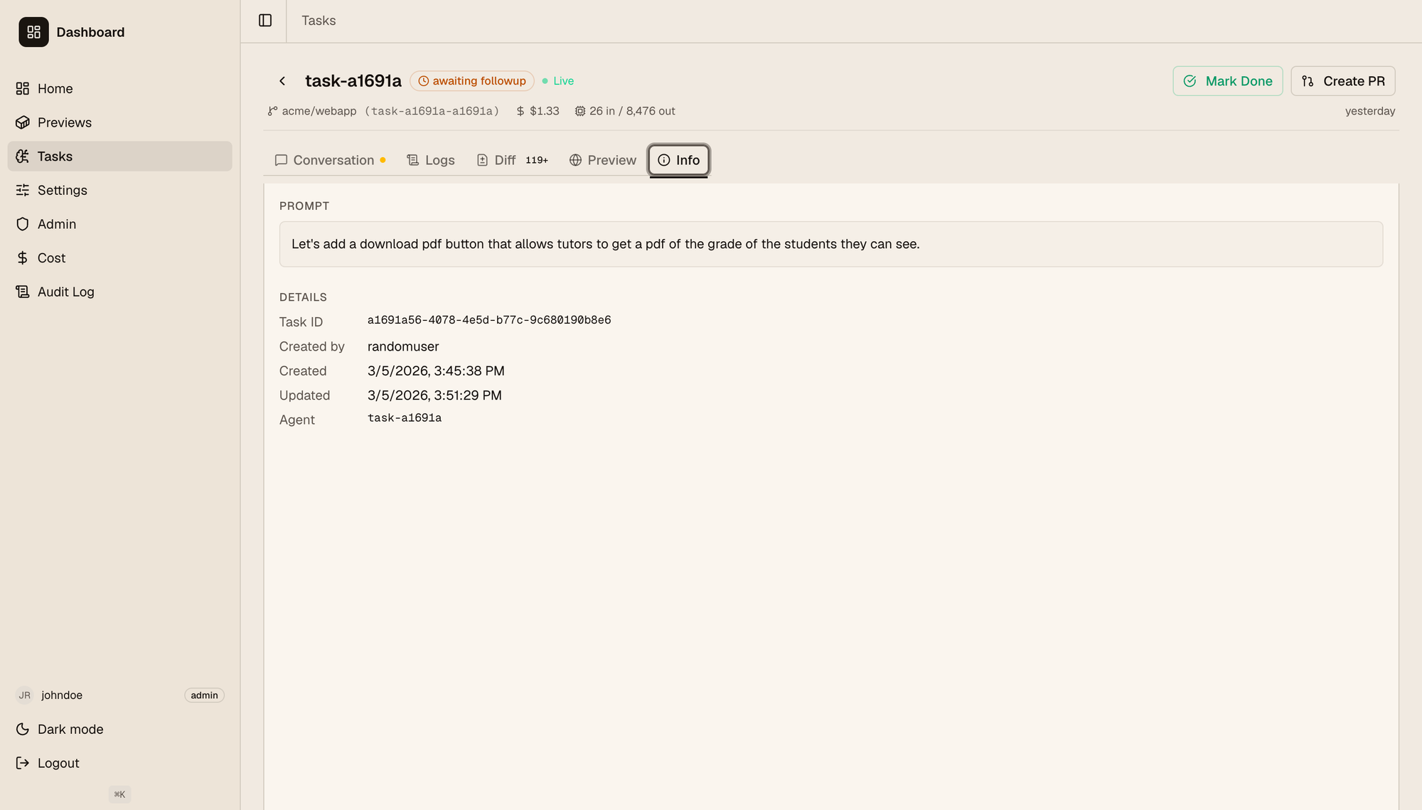 每个卡片上显示的链接都指向其部署的虚拟机,因此任何人都可以快速阅读提示,然后立即看到它的实际运行。从左侧可以看出,仪表板具有带有角色和权限的 RBAC 模型;用户拥有不同的权限,可能只能查看特定的仓库,拥有只读访问权限(即可以查看任务但不能与代理交互),等等。我们还跟踪每个用户的代理成本,并将其显示给管理员,以确保我们不会超支。我们使用 OpenRouter 开箱即用地支持不同的模型,用户可以从其设置选项卡中选择。