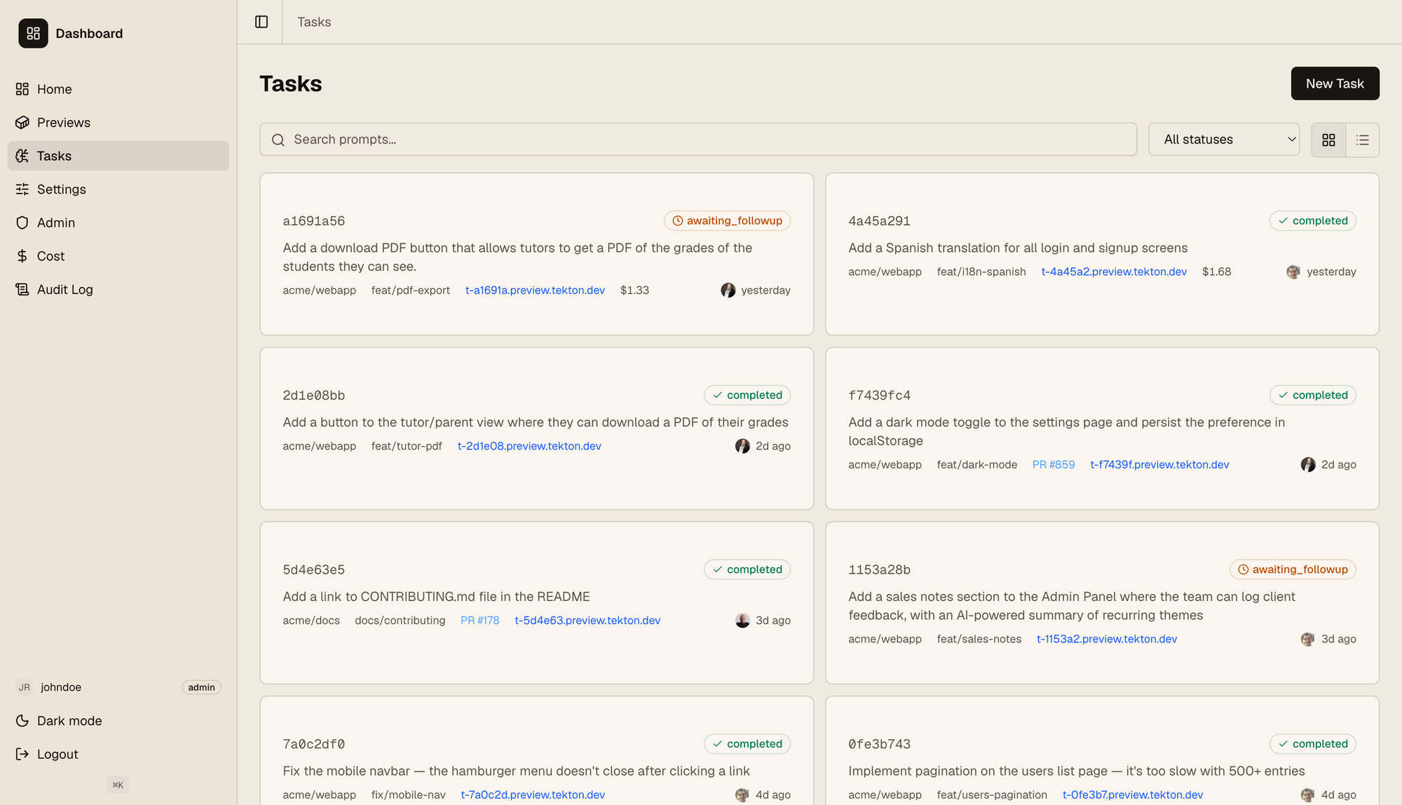 有了这个,任何人都可以从一个新想法开始,在一个隔离的环境中让代理在其上工作,并在几秒钟内将其部署到虚拟机上。在此基础上,我们建立了一个 Web 仪表板,供组织中的任何人使用并查看其他人正在进行的工作。这不仅适用于开发人员;产品经理和团队中其他非技术人员也可以使用它来尝试想法并获得关于其他人正在做什么的更好反馈。