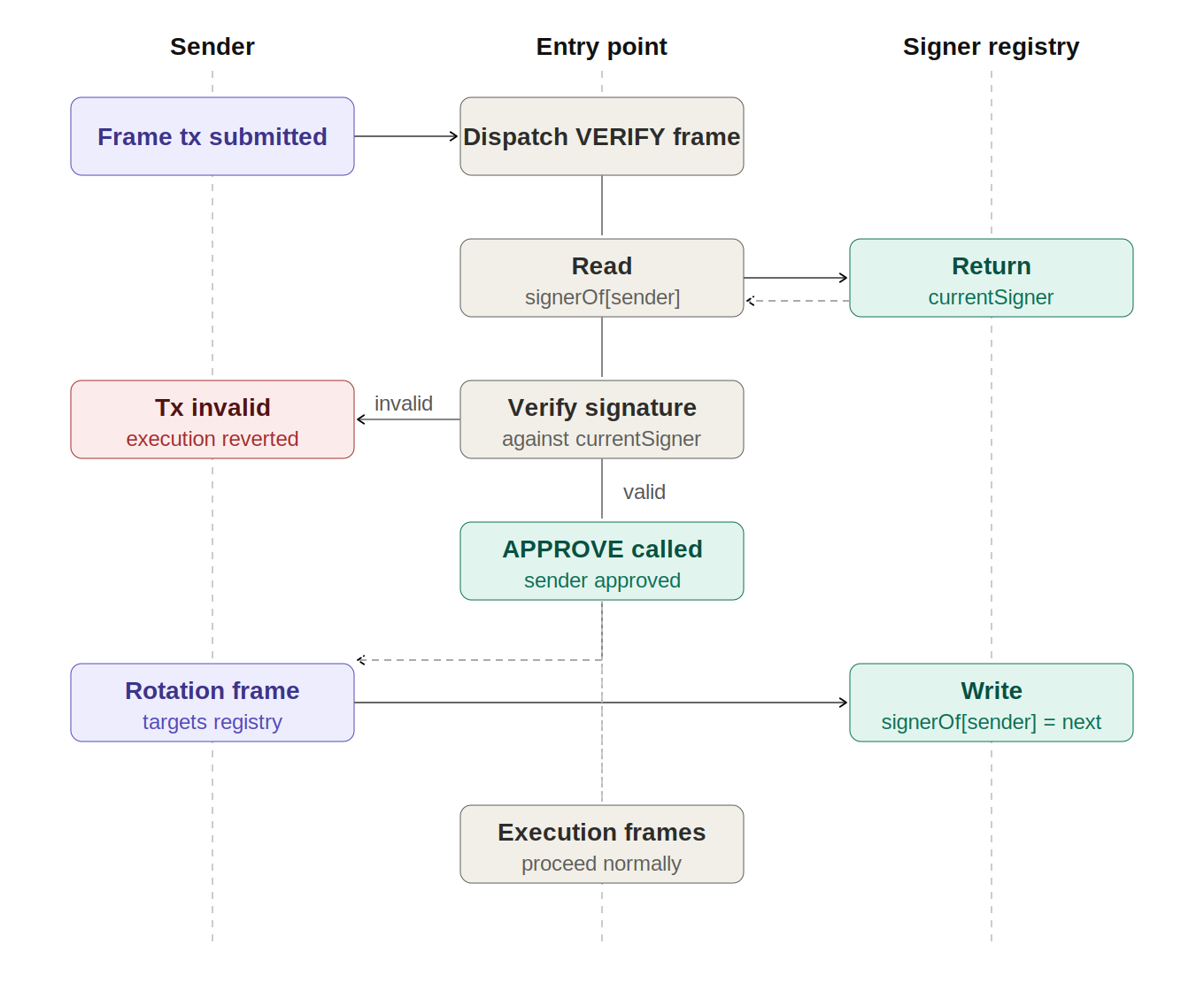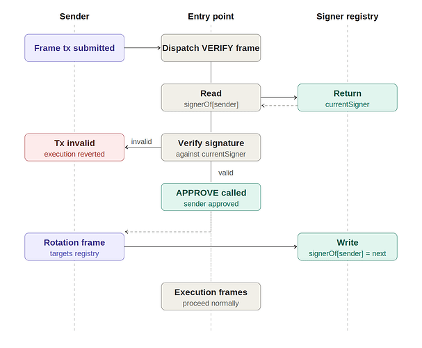 • 如果验证通过,tx.sender 的注册表条目将更新为 nextSigner,完成轮换: