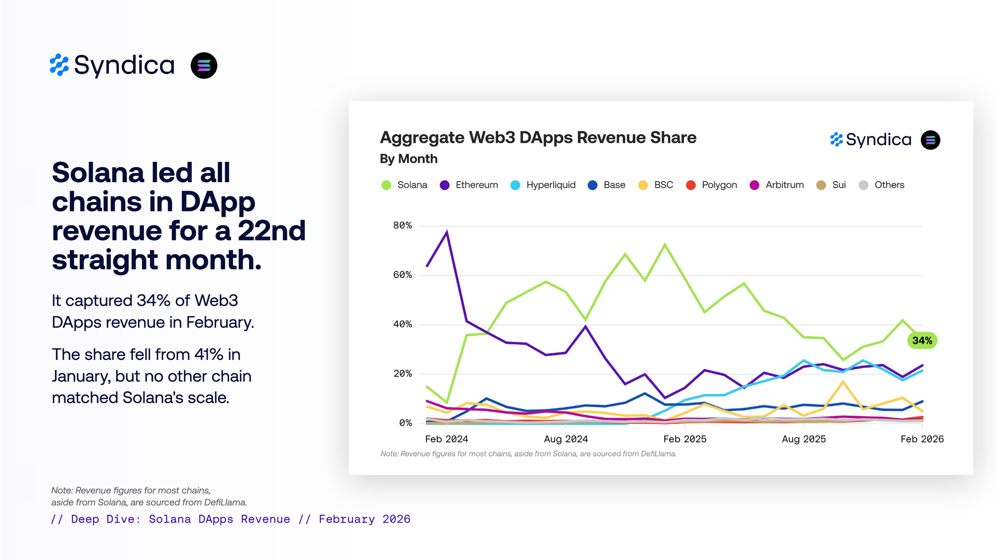 2 月份,Solana 占据了 Web3 DApp 总营收的 34%。虽然这一比例较 1 月份的 41% 有所下降,但尚无其他区块链能达到 Solana 的规模。