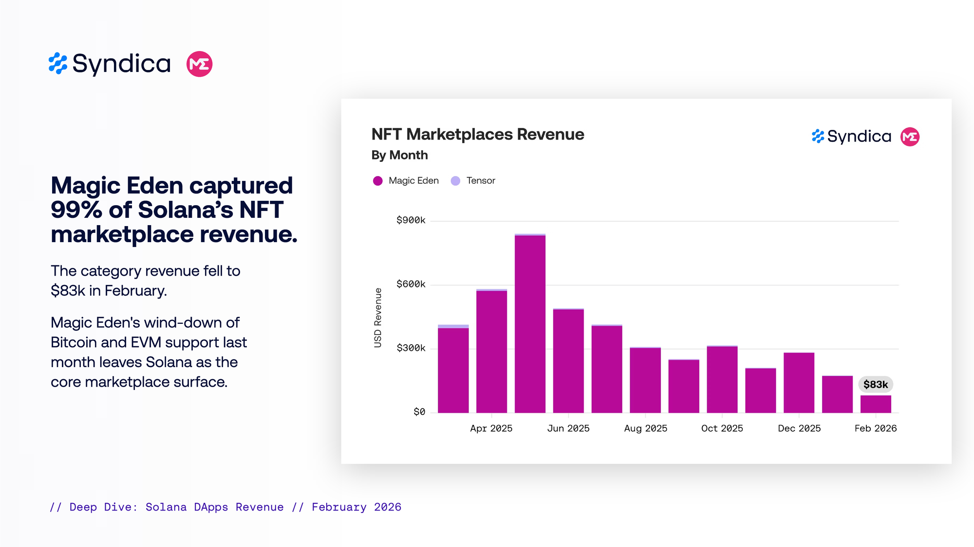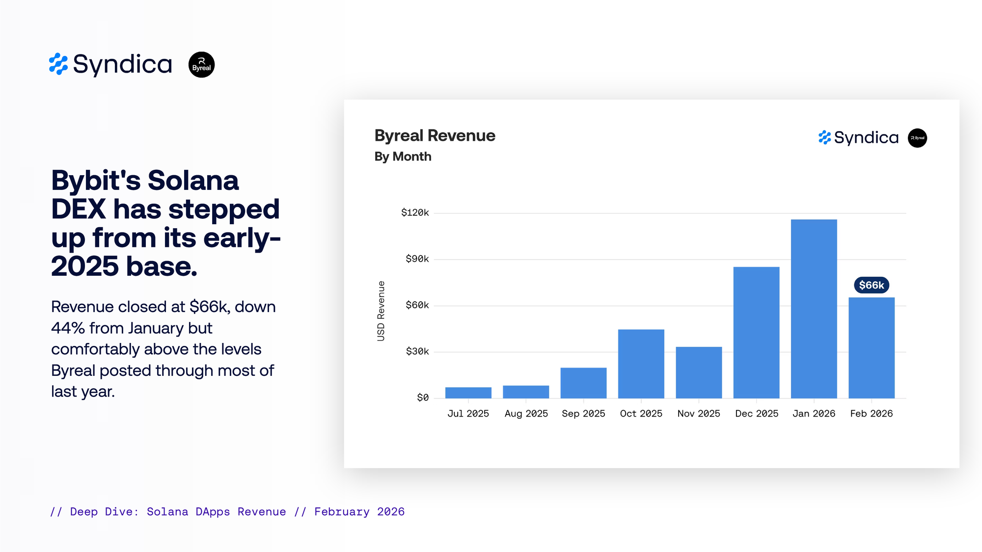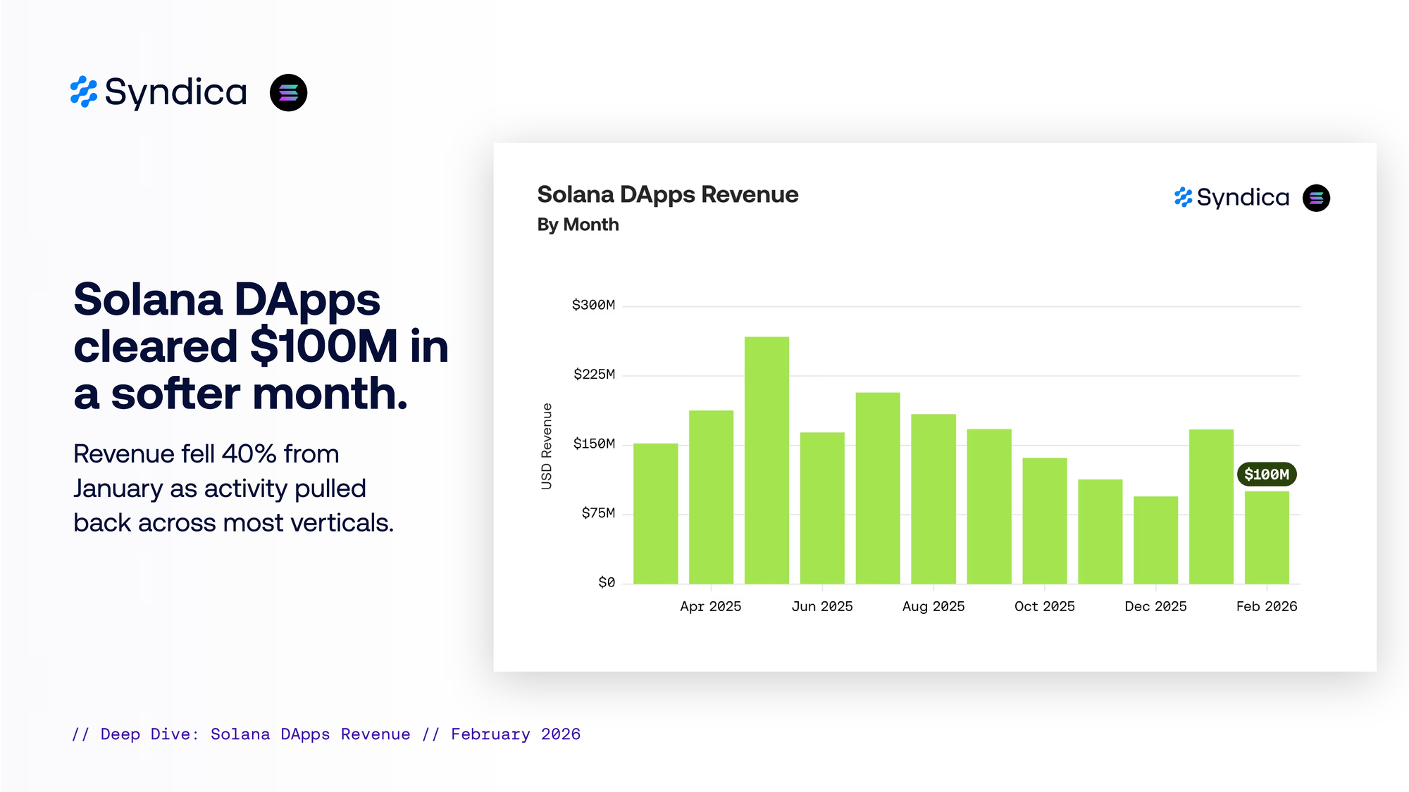 在整体市场放缓的月份,Solana DApps 的营收仍突破了 1 亿美元。受多数垂直领域活跃度回落影响,营收较 1 月份下降了 40%。