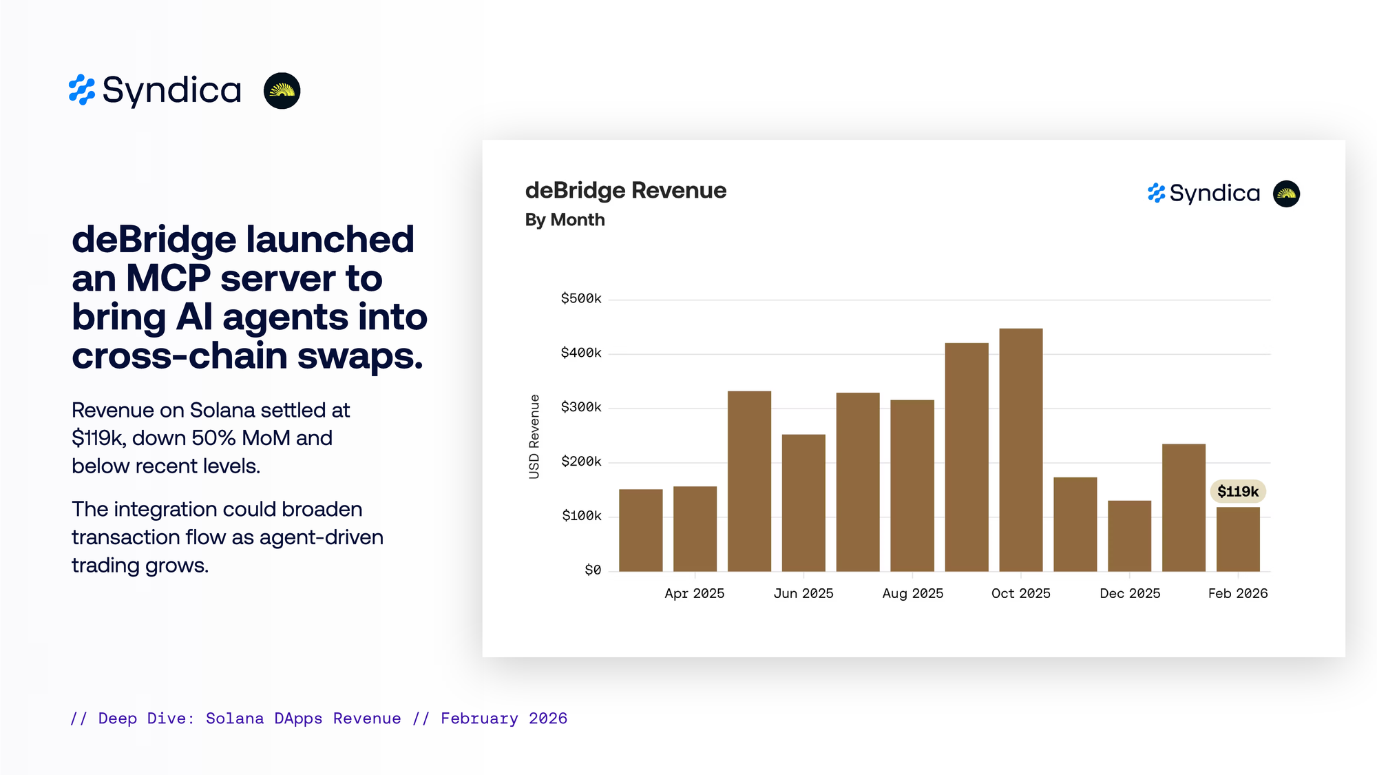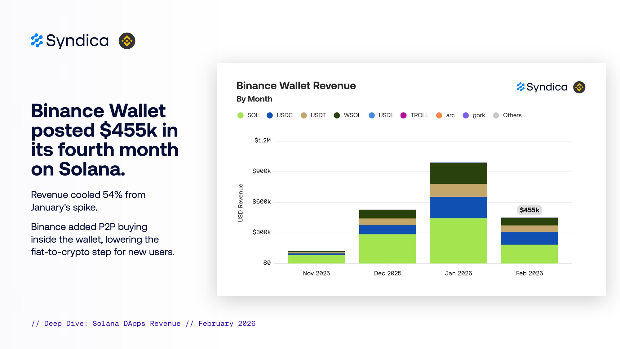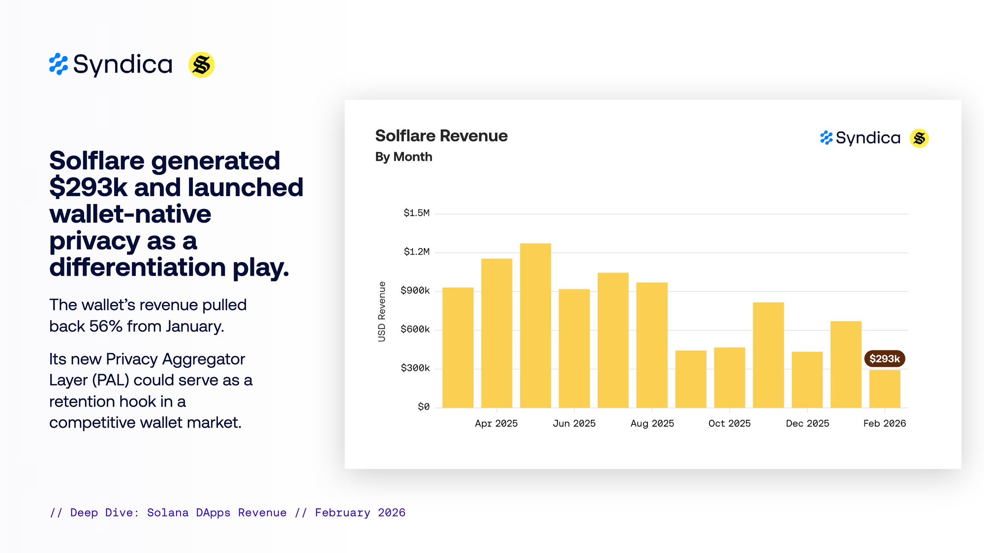 在整体市场放缓的月份,Solana DApps 的营收仍突破了 1 亿美元。受多数垂直领域活跃度回落影响,营收较 1 月份下降了 40%。
