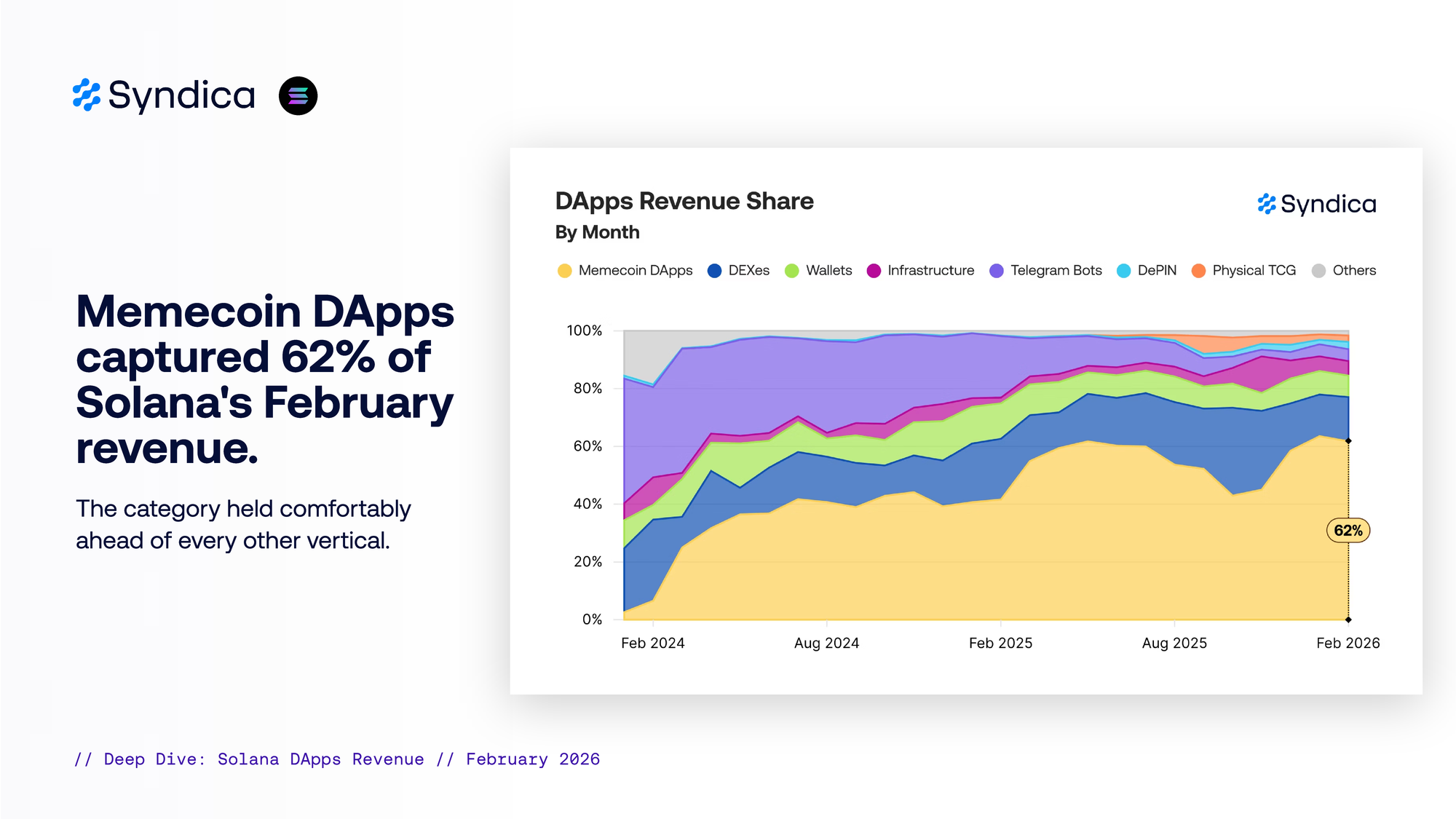 Meme 币相关 DApp 占据了 Solana 2 月营收的 62%,该类别依然遥遥领先于其他所有垂直领域。