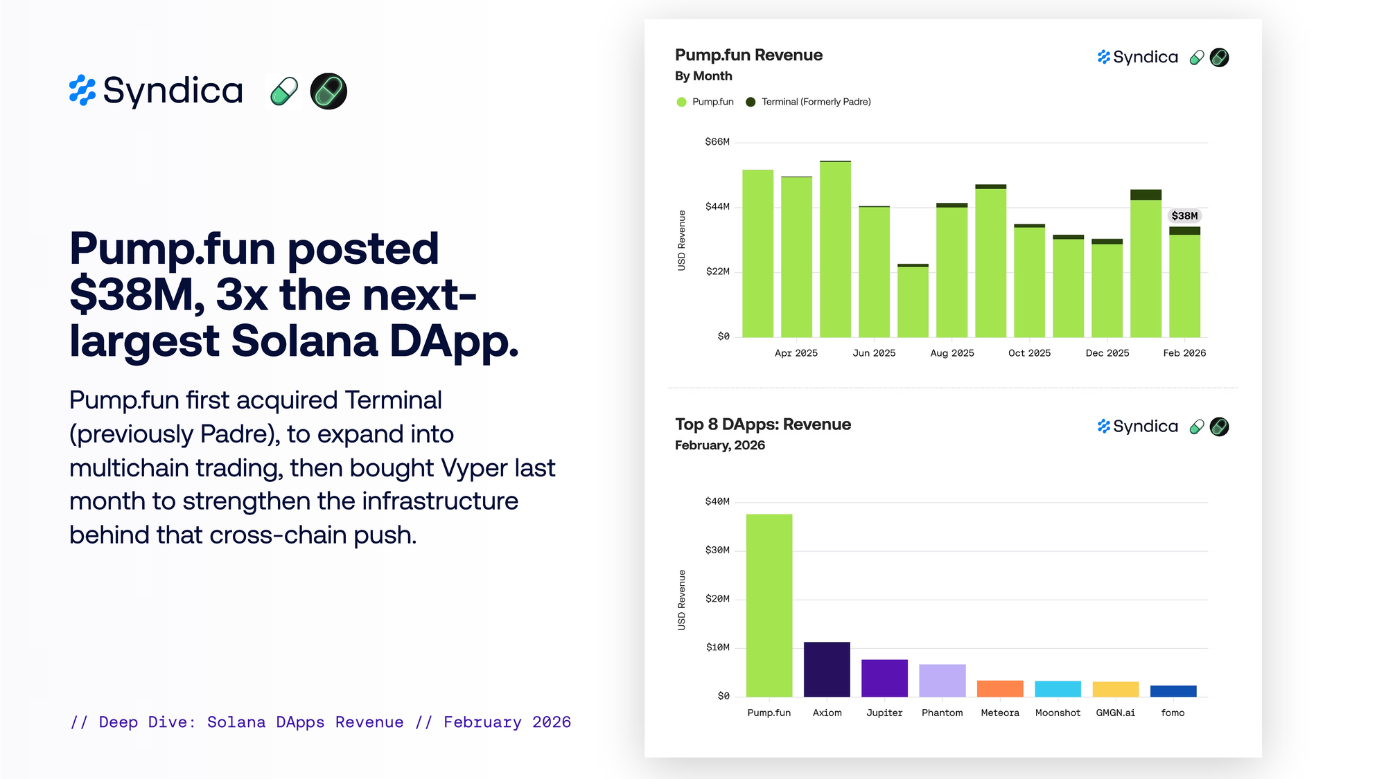 Pump.fun 营收达 3800 万美元,是 Solana 排名第二 DApp 的 3 倍。Pump.fun 先是收购了 Terminal(原名 Padre)以扩展多链交易,上个月又收购了 Vyper,以强化其跨链推进背后的基础设施。