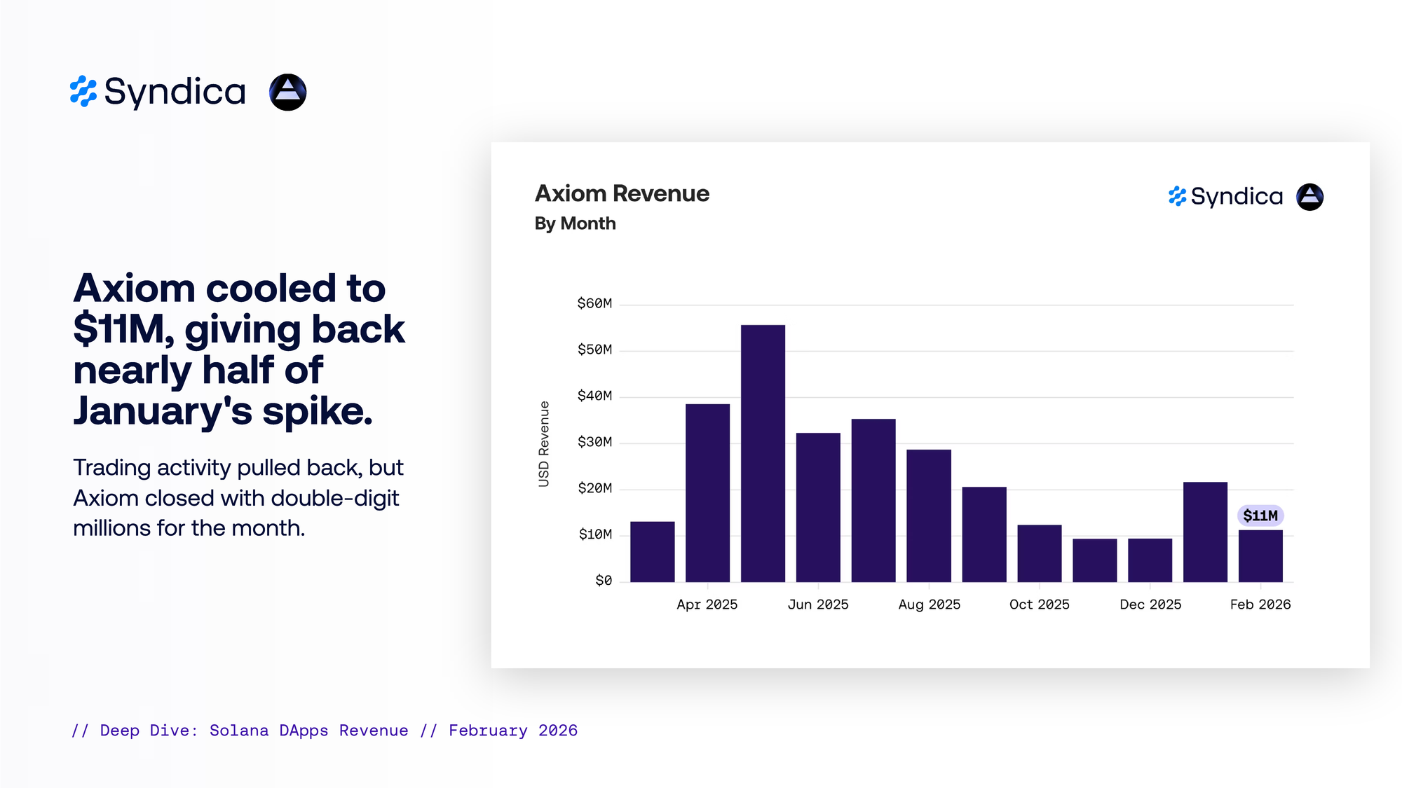 Axiom 营收降至 1100 万美元,较 1 月份的高点回落了近一半。尽管交易活动有所减少,但 Axiom 本月仍以千万美元级别的营收收官。