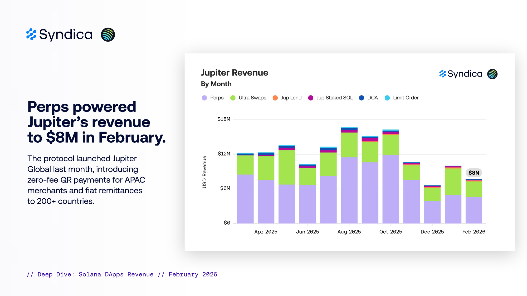 永续合约 (Perps) 推动 Jupiter 2 月营收达到 800 万美元。该协议上个月推出了 Jupiter Global,为亚太地区商家引入了零费用的 QR 支付,并支持向 200 多个国家进行法币汇款。