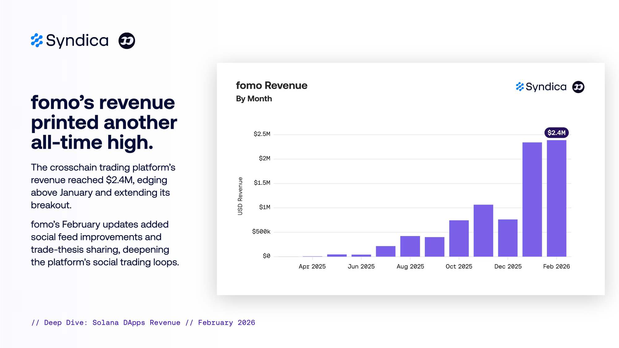 fomo 的营收再创新高。这个跨链交易平台的营收达到 240 万美元,略高于 1 月份,延续了其突破势头。fomo 在 2 月的更新中改进了社交动态和交易逻辑分享功能,深化了平台的社交交易闭环。