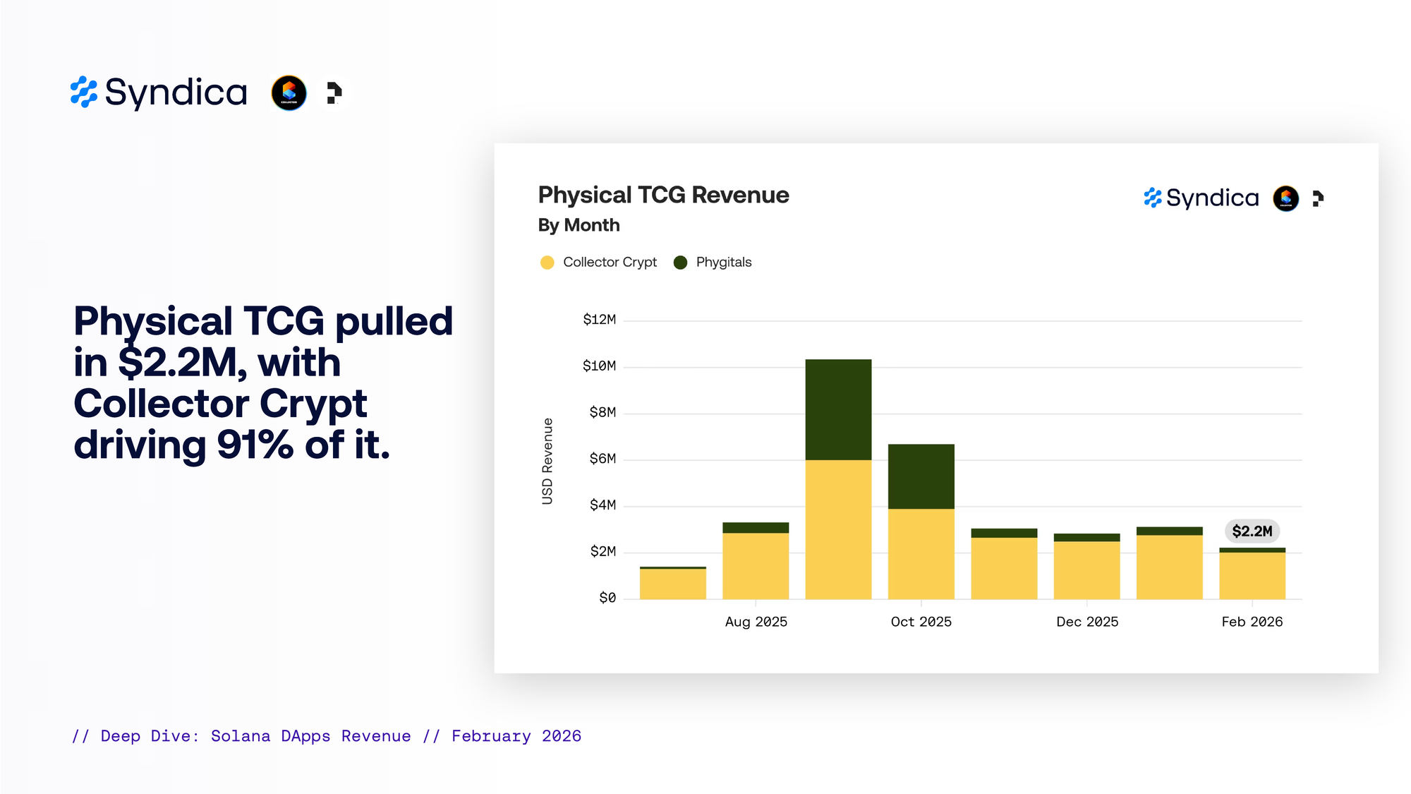 实体交易卡牌游戏类别共产生 220 万美元营收,其中 Collector Crypt 贡献了 91%。