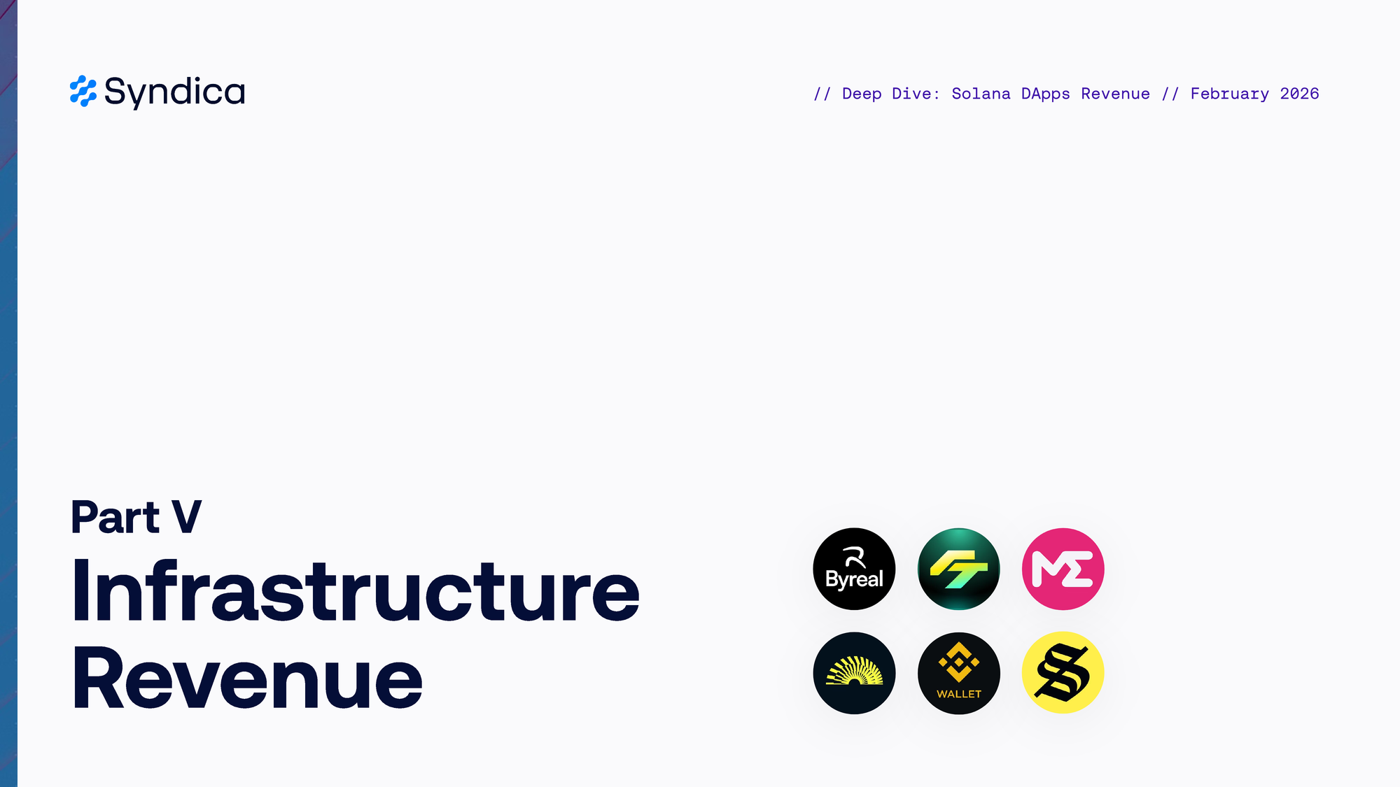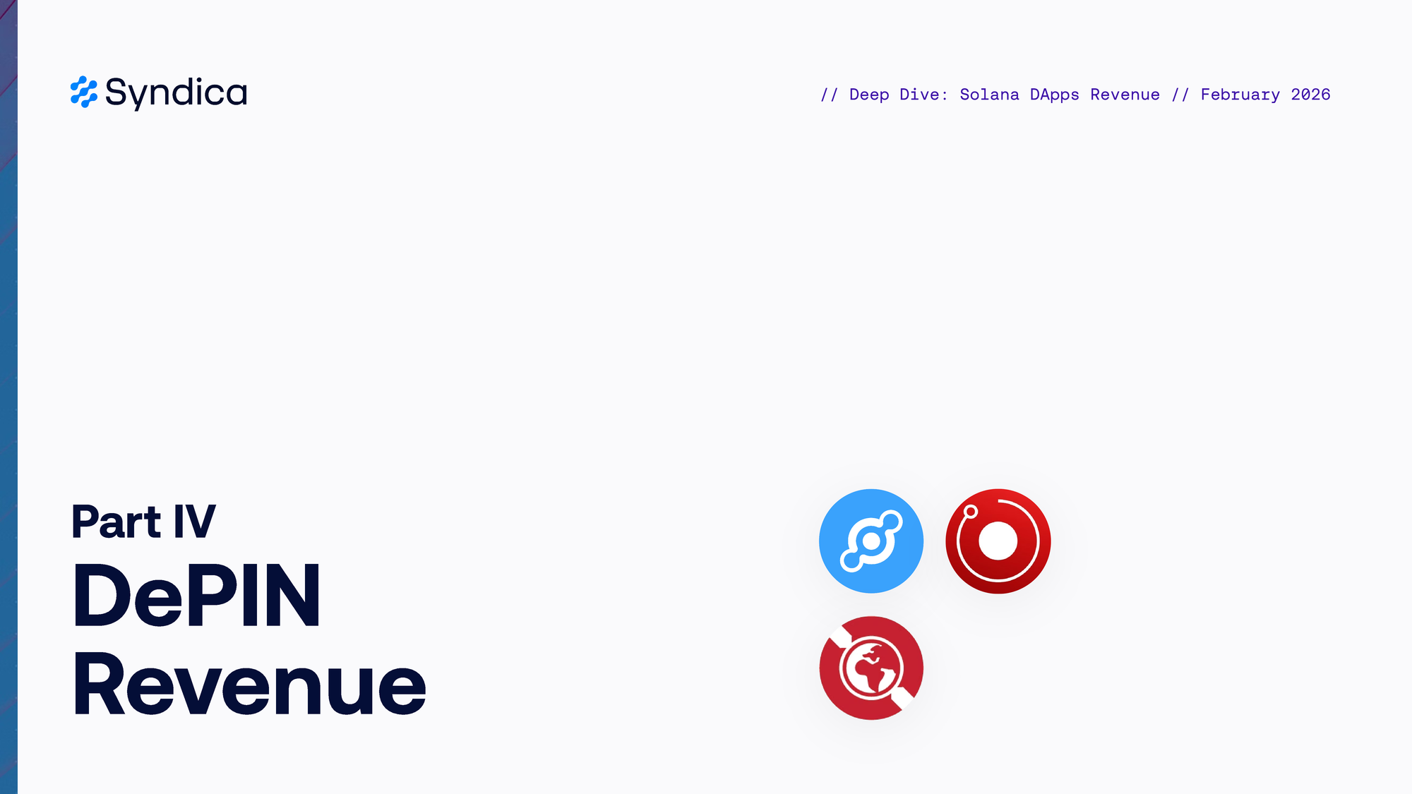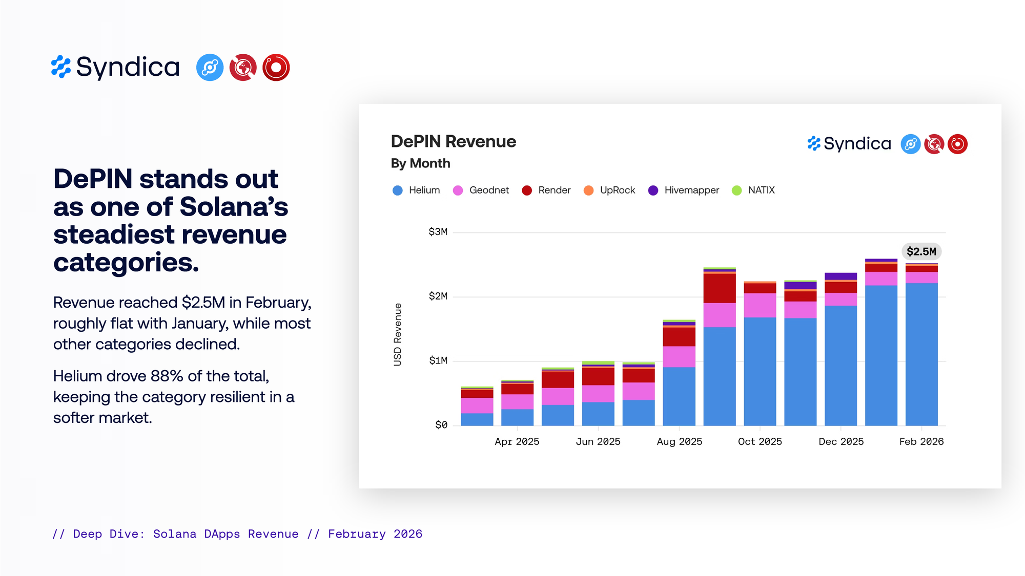 DePIN 是 Solana 最稳定的营收类别之一。2 月份营收达到 250 万美元,与 1 月份基本持平,而大多数其他类别均出现下滑。Helium 贡献了总额的 88%,使该类别在疲软的市场中保持了韧性。