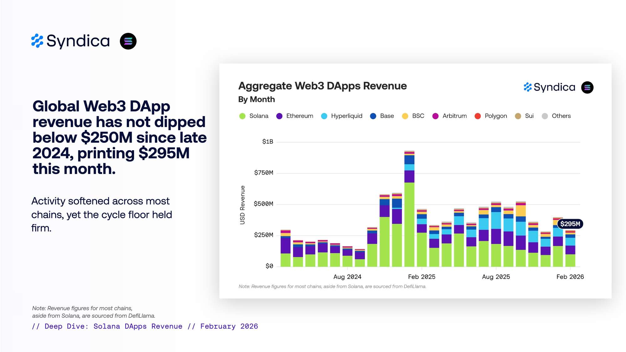 全球 Web3 DApp 营收降至 2.95 亿美元,但仍远高于周期底部。尽管大多数区块链的活跃度有所减弱,但自 2024 年底以来,月度营收从未低于 2.5 亿美元。