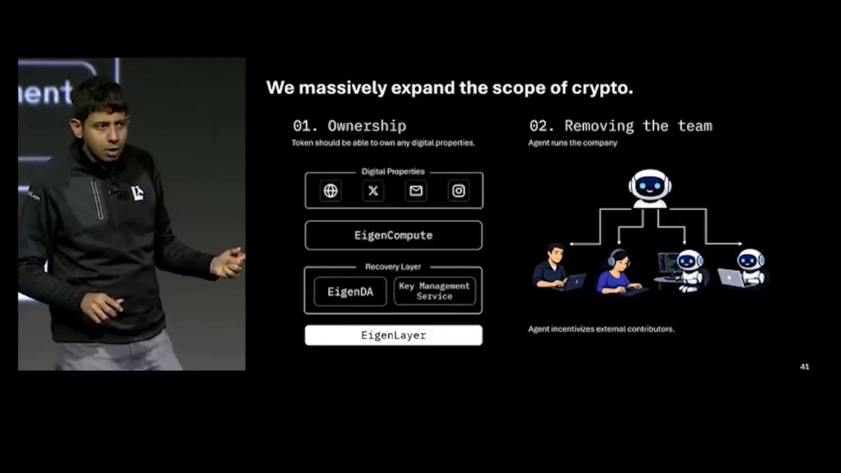 如果你能在智能合约中构建一个 Agent,你就可以将一个智能 Agent 绑定到一个加密和合约基石上。然后,该 Agent 就可以开始根据自身情况拥有、运营和协调资产。这是从“工具”向“公司”跨越的第一座真正桥梁。