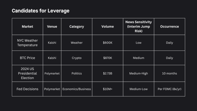 然而,预测市场的杠杆不仅仅是在现有交易场所增加保证金的问题。其可行性取决于三点: