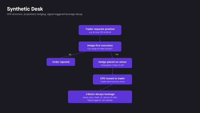 合成柜台模型采取了不同的方法:交易者从不直接接触预测市场。相反,柜台作为交易对手方位于交易者和底层交易场所之间。交易者选择方向、杠杆水平和抵押品金额;柜台记录一个合成头寸,并使用自己的资金在底层市场进行对冲。从结构上讲,这是一种差价合约 (CFD)。