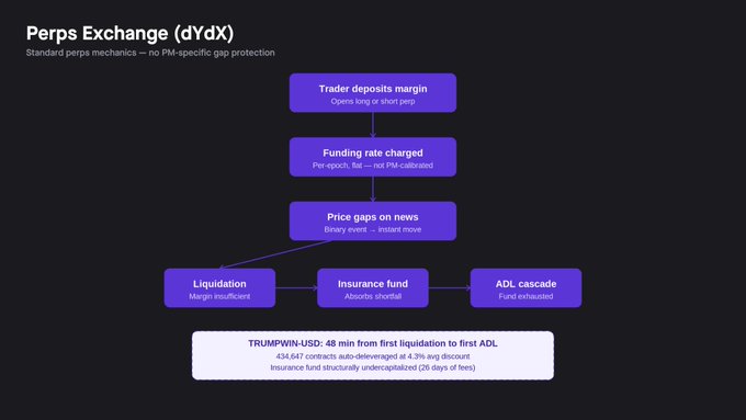 缺点是结构性的。标准的永续合约假设多方和空方之间存在持续、平衡的博弈。预测市场违反了这一点,因为它们具有收敛性。随着某个结果变得可能,价格会收敛向 $0 或 $1,账簿的一侧会崩溃。亏损的一方没有动力继续持有,而获胜的一方没有交易对手向其支付资金。资金费率恰恰在合约接近其最重要的时刻时爆发。