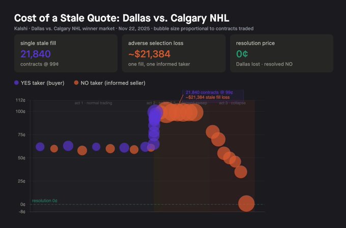 陈旧的价格报价是在信息离散到达的情况下运行连续限价订单簿的一个主要后果。例如,在 2025 年 11 月 22 日,Kalshi 上的一个 NHL 比赛市场在点球大战期间看到不知情的买家将价格推高至 99¢。知情的卖家识别出了这种错位并清扫了超过 37,000 份合约。该市场在 20 分钟后以 0¢ 结算,导致流动性提供者遭受了巨大的逆向选择损失。