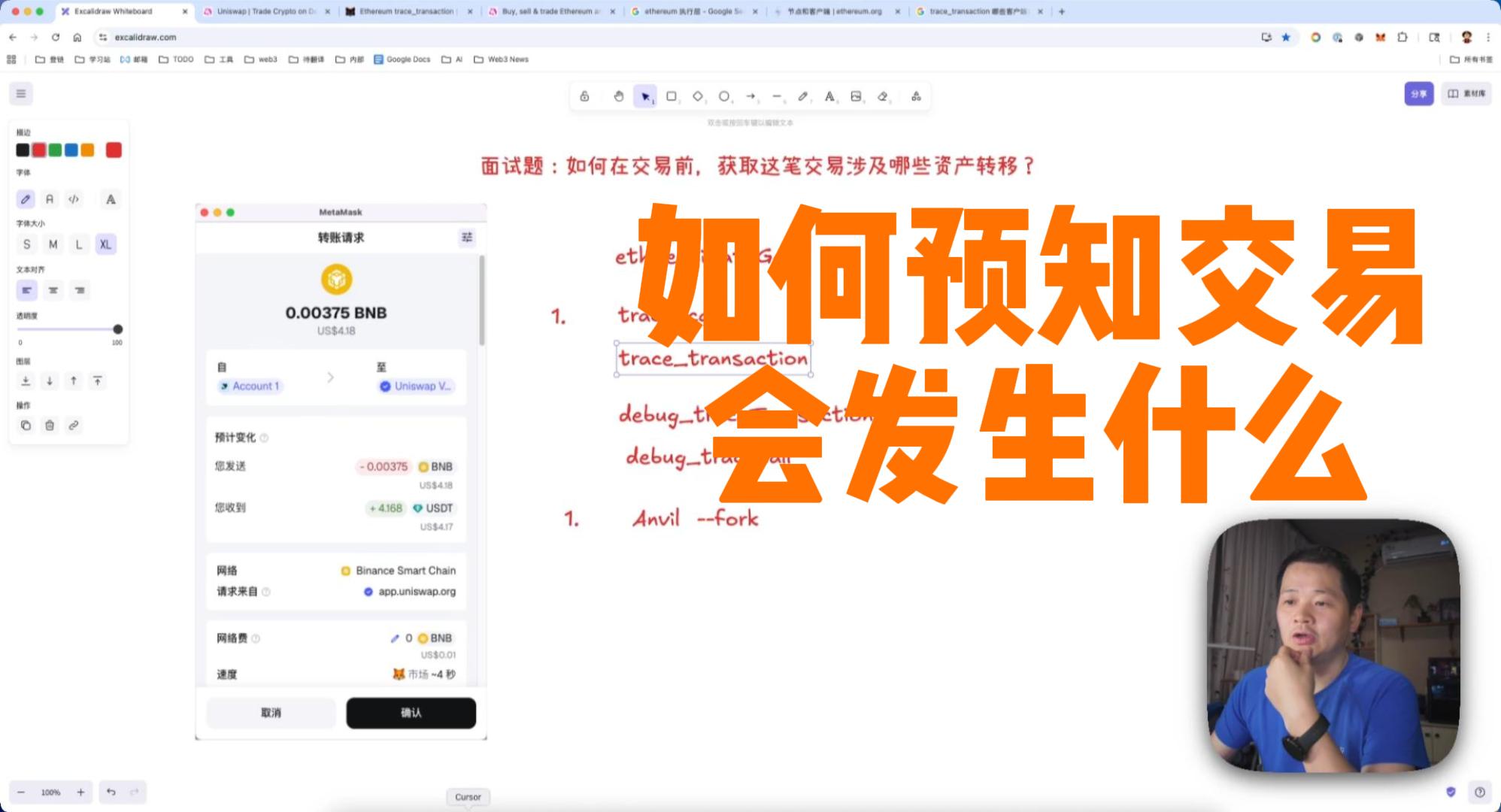 视频 AI 总结: 该视频讲解了在交易前如何获取交易可能涉及的资产转移,类似于 Metamask 交易确认框中显示的预计变化。Tiny熊老师通过一个面试题引出,并提供了几种解决方案,包括使用 RPC 节点的 trace 接口(trace_call 和 trace_transaction)或 Debug 接口,以及在本地 Fork 主网状态并重放交易分析日志。 关键信息: * **核心问题:** 如何在交易前预知交易涉及的资产转移。 * **方案一:** 使用 RPC 节点的 trace 接口(trace\_call, trace\_transaction)或 Debug 接口(Debug\_trace, Debug\_trace\_call)分析调用栈,但这些接口可能不标准或未开放。 * **方案二:** 在本地 Fork 主网状态,重放交易,分析本地执行的交易日志,从中解析 ERC20 Transfer 日志。 * **代码演示:** 通过模拟合约(DepositETH 和 ERC20 转账)展示了如何使用不同方法(本地执行、trace\_transaction、Debug\_Transaction、trace\_call)获取资产转移信息。 * **ETH 转账识别:** ETH 转账不涉及日志,需要通过 trace 分析 Call 调用中的 Value 来识别。
